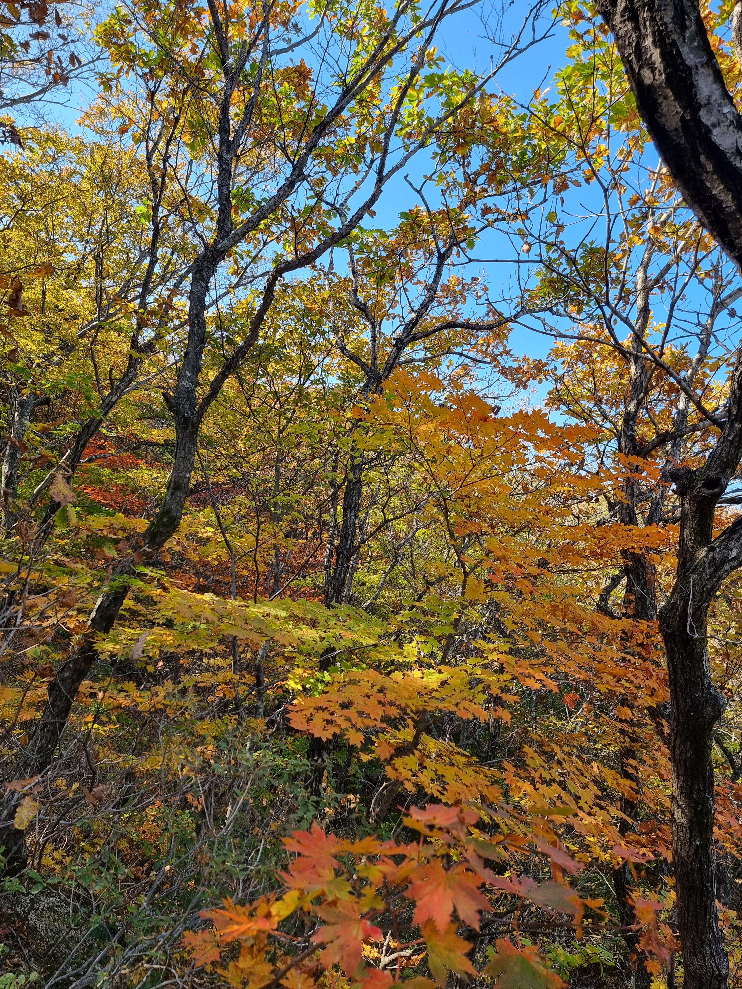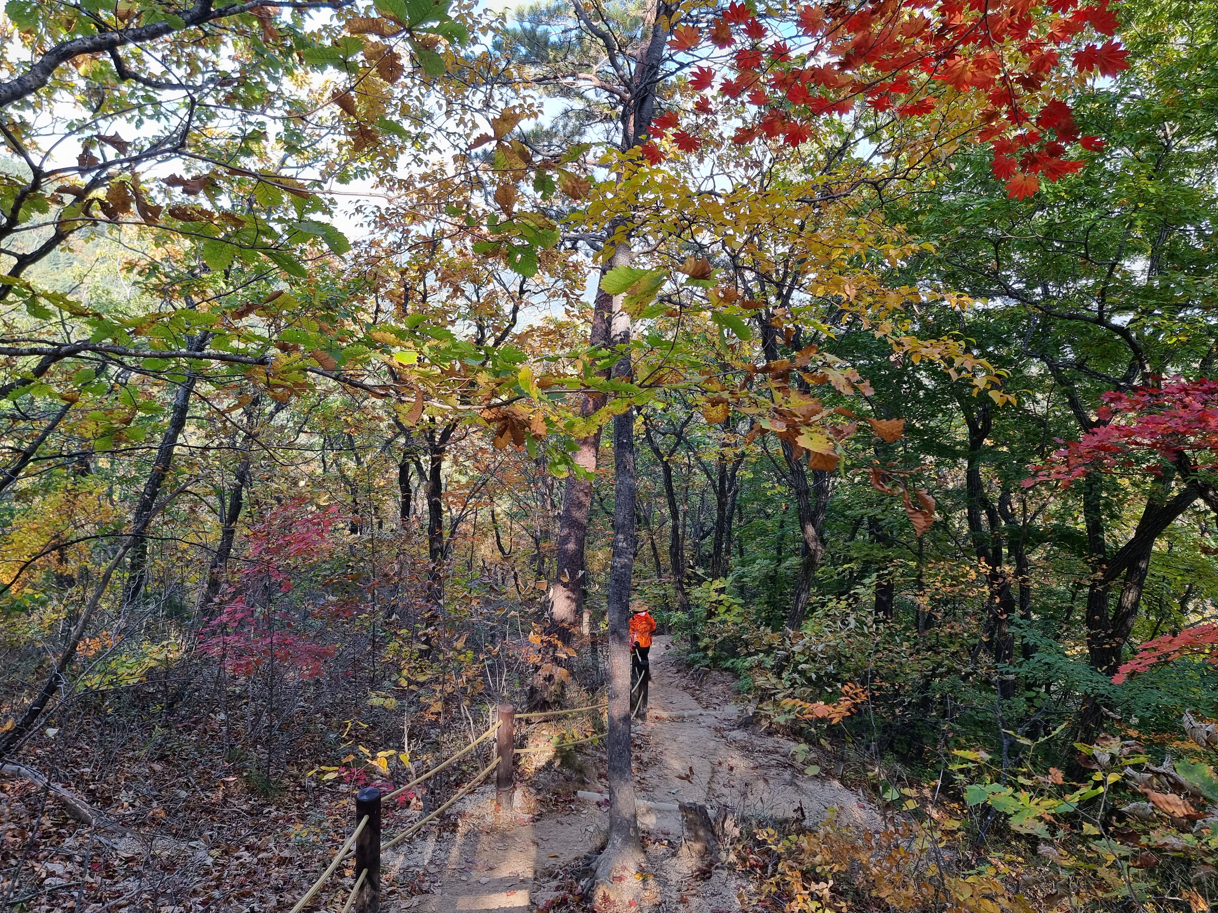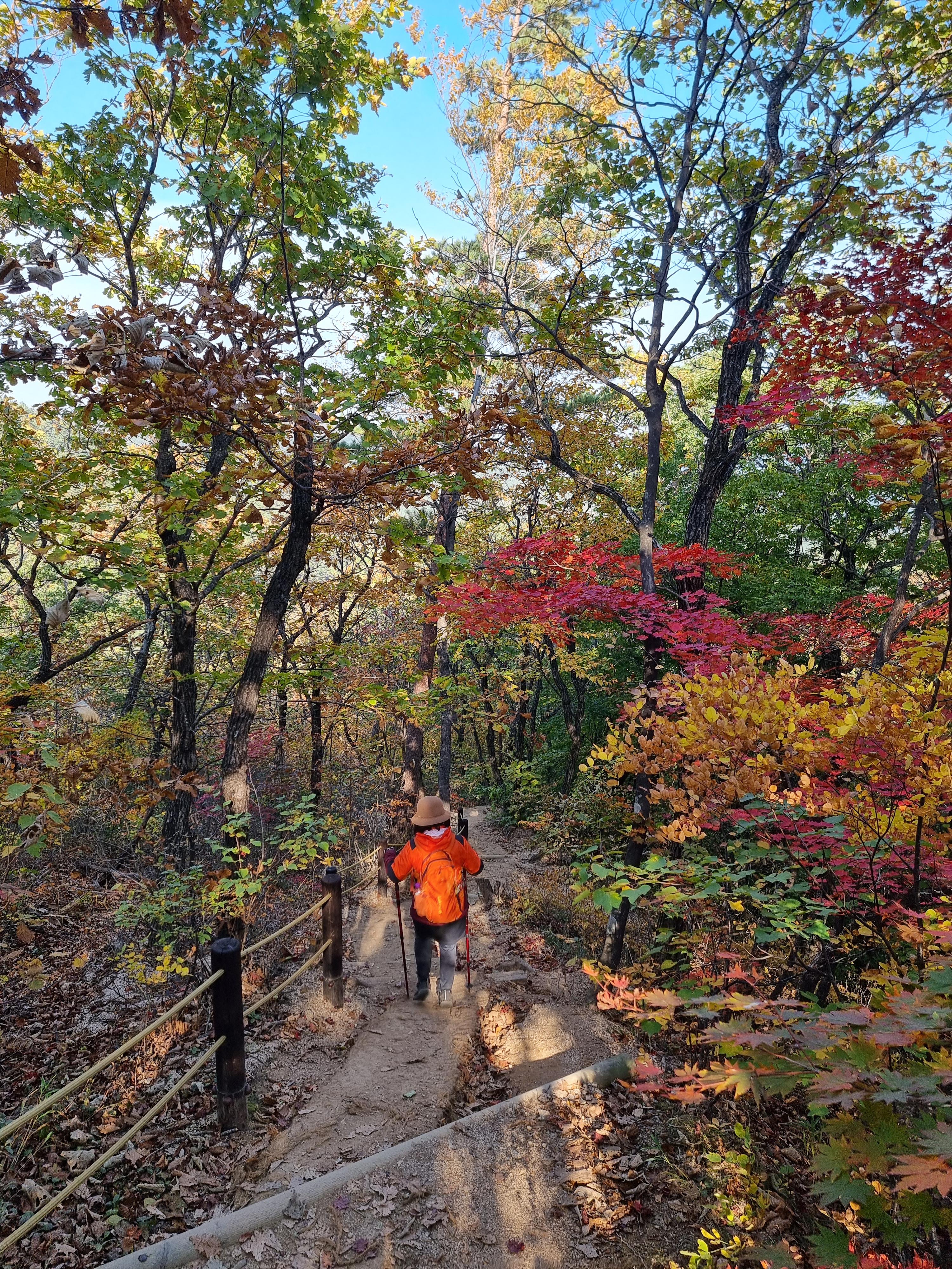 가파른 길옆으로 아름다운 단풍이 있어 즐거움에 신이 납니다.