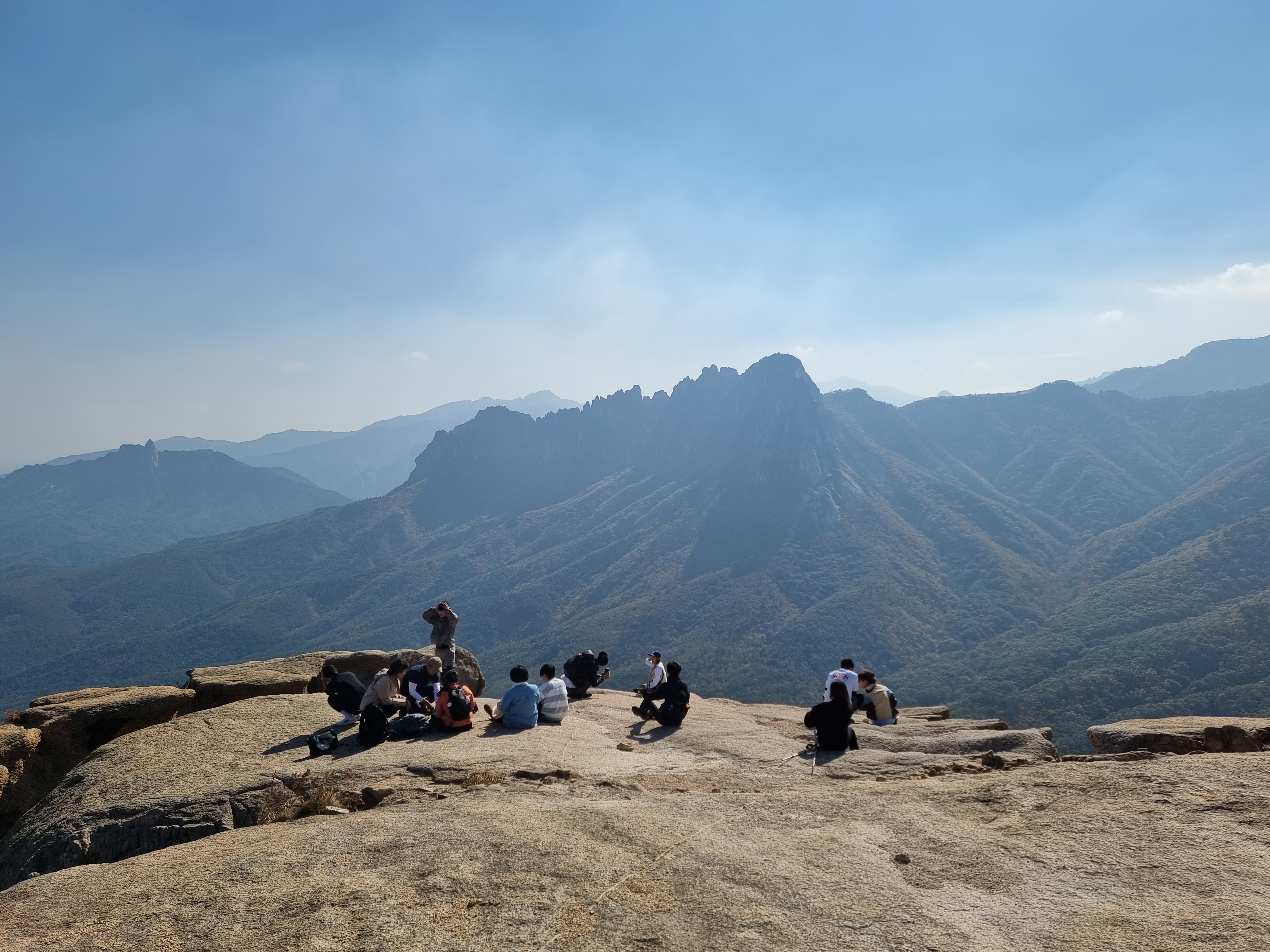낙타봉 앞 광장바위에서 사람들이 휴식도 취하고 간식도 먹고, 경치를 즐기고 있습니다.