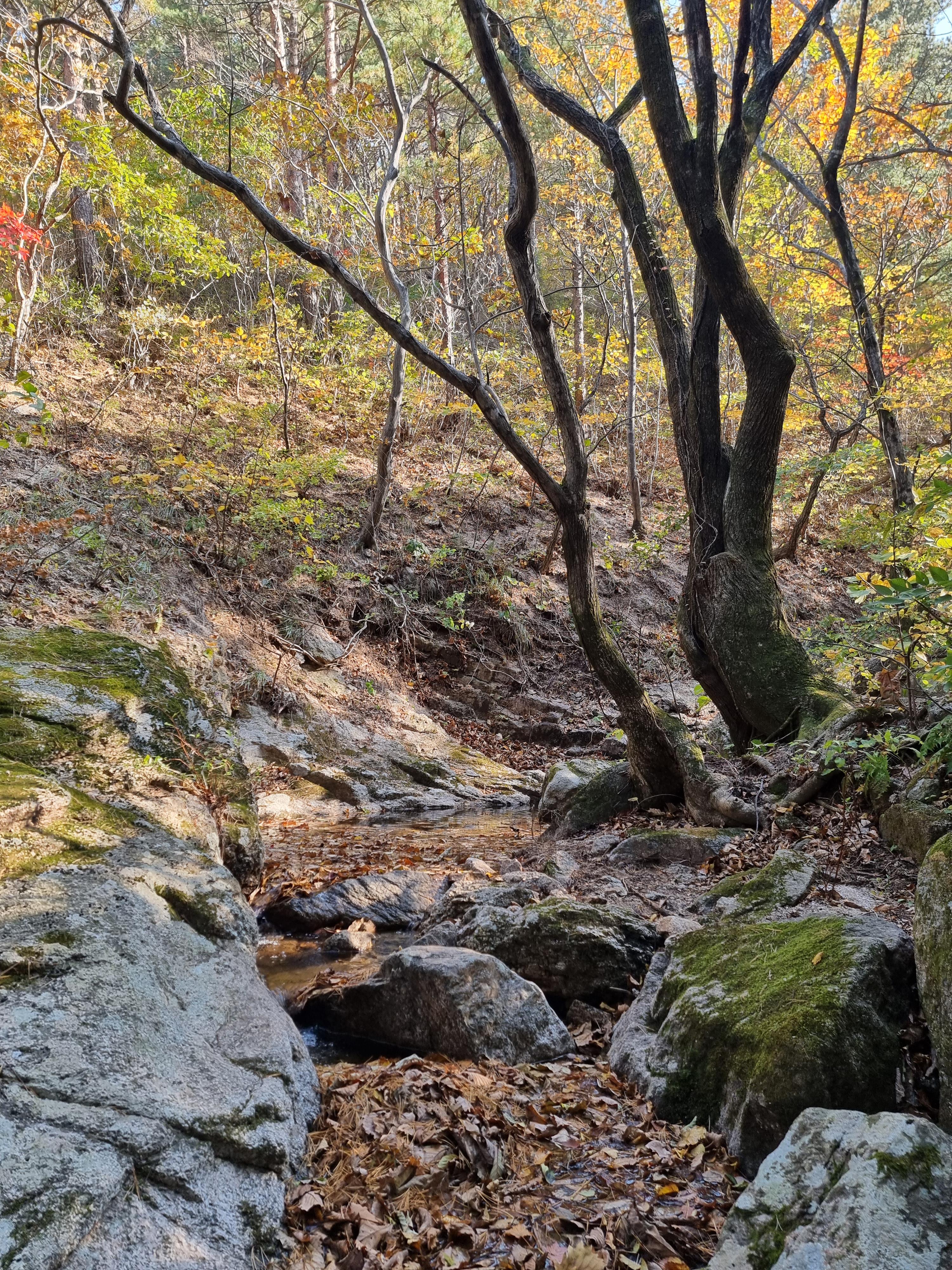 골짜기를 내려오면 떨어진 낙엽이 물을 따라 흐르다 돌에 걸려 수북히 뭉쳐 있습니다.