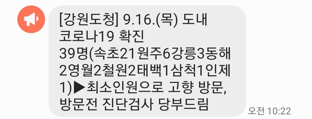[강원도청] 9.18.(토) 도내 코로나19 확진 46명(원주11 강릉11 속초11 춘천3 고성3 인제2 태백1 횡성1 영월1 정선1 양양1)▶방역수칙 준수 당부