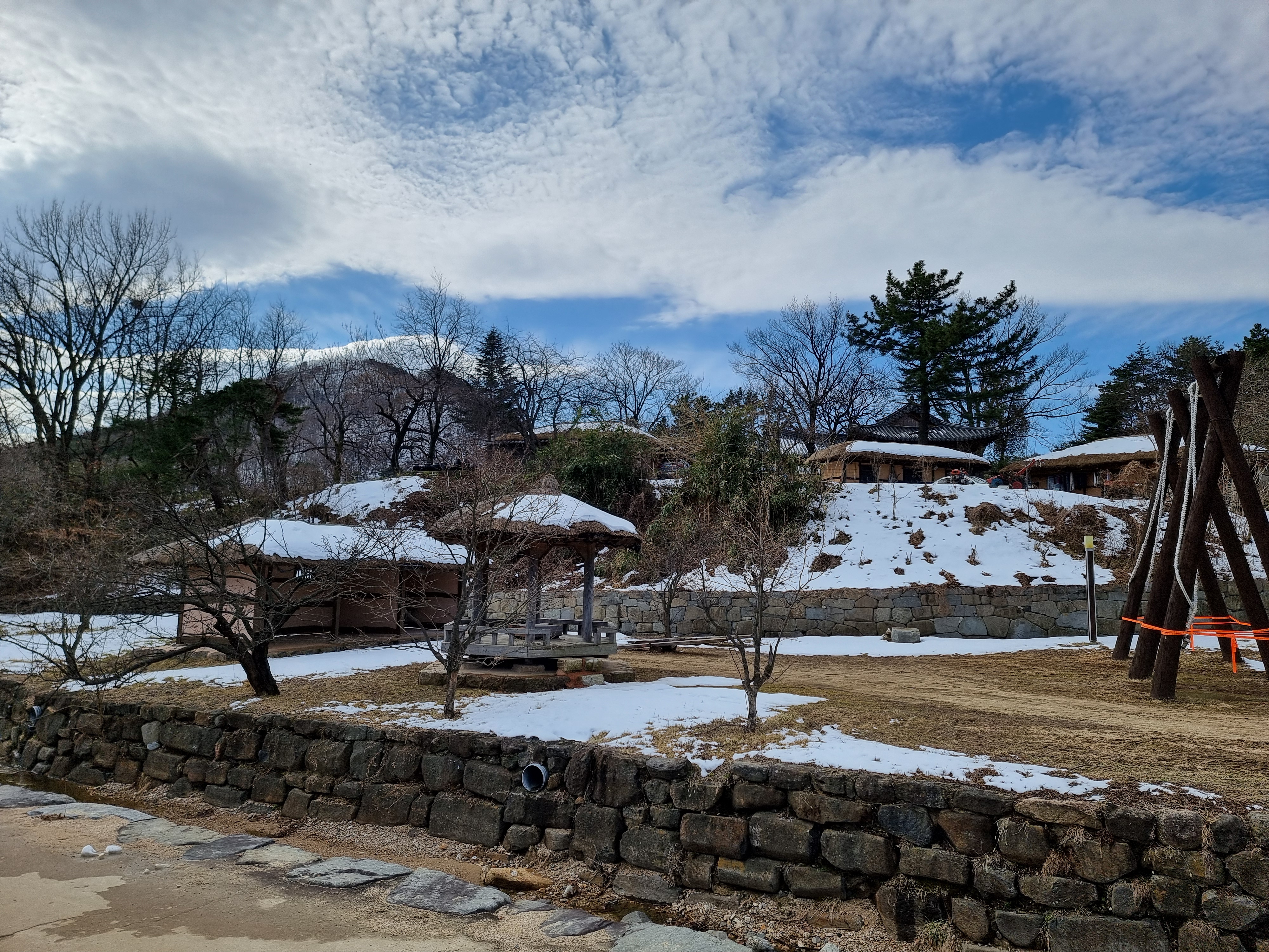 옛날 초가집에 돌담 그리고 그네를 만든게 영락없이 민속촌 마을을 보는 듯 해요.