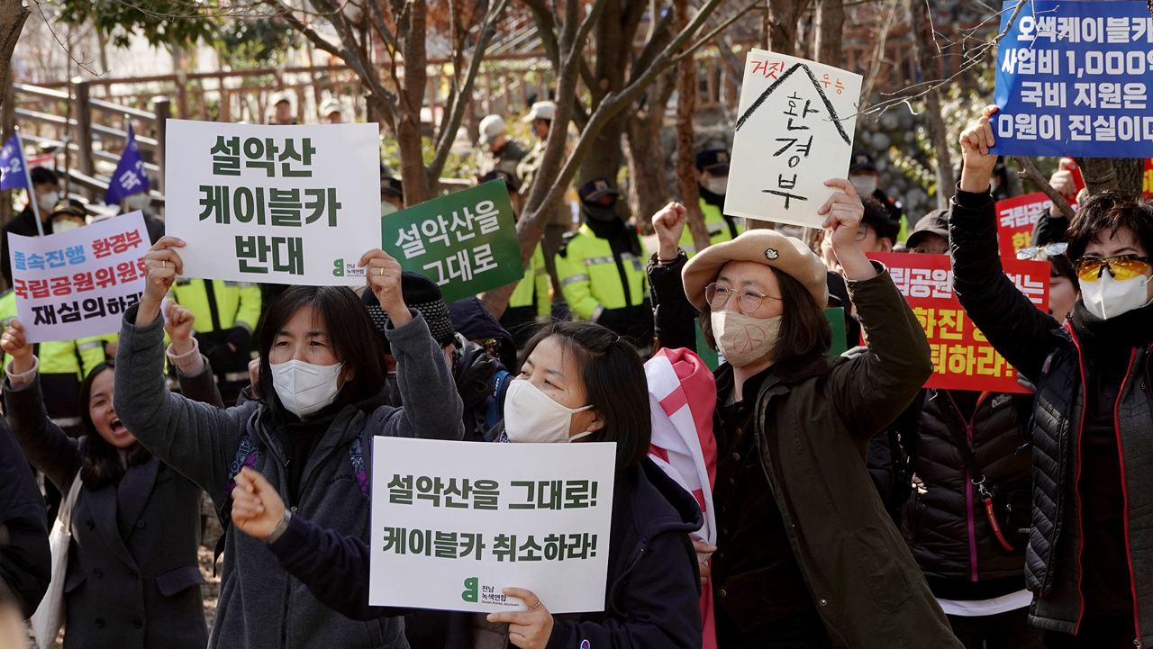 속초고성양양환경운동연합 이열호 공동의장은 “정권이 바뀌자마자 설악산 케이블카를 허가해주는 일을 저질렀다. 국립공원의 케이블카를 설치하는 일은 민족의 영산에 대못을 박는 일”이라며 설악산을 지킬 것이라는 결의를 밝혔다.