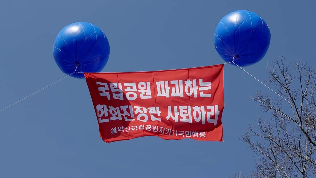 지난 2월 27일 환경부는 ‘조건부 협의’ 결정으로 설악산 오색케이블카 사업을 허가했다. 이 결정으로 전국 국립공원에 산적한 개발 사업들이 줄줄이 추진될 위기에 처했다. 시민들은 설악산을 파괴하는 결정을 내려놓고 국립공원의 날을 기념하는 환경부의 몰염치함을 규탄하며, 환경 파괴에 앞장서는 한화진 장관의 즉각 사퇴를 요구했다.