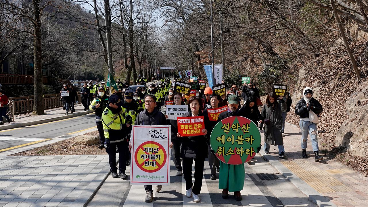 국립공원을 사랑하는 시민들과 국립공원무등산지키기시민연대, 설악산국립공원지키기국민행동, 강원행동, 케이블카반대설악권주민대책위와 지리산산악열차반대대책위는 오늘 국립공원을 파괴하는 한화진 환경부장관의 사퇴를 요구하며 국립공원의날 행사장인 문빈정사 방향으로 행진했다. 하지만 문빈정사 근처에서 경찰들에 의해 제지되며 행진이 중단 되었다.