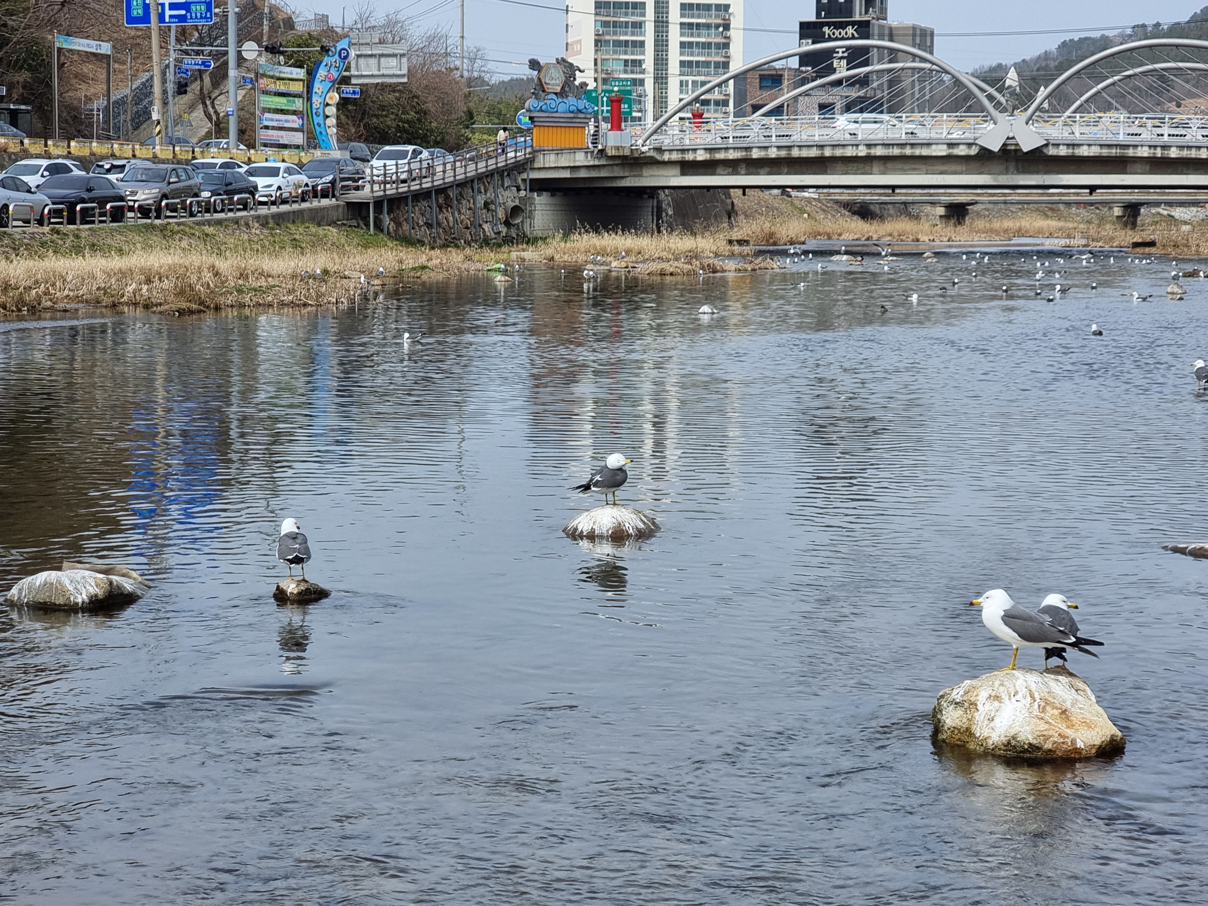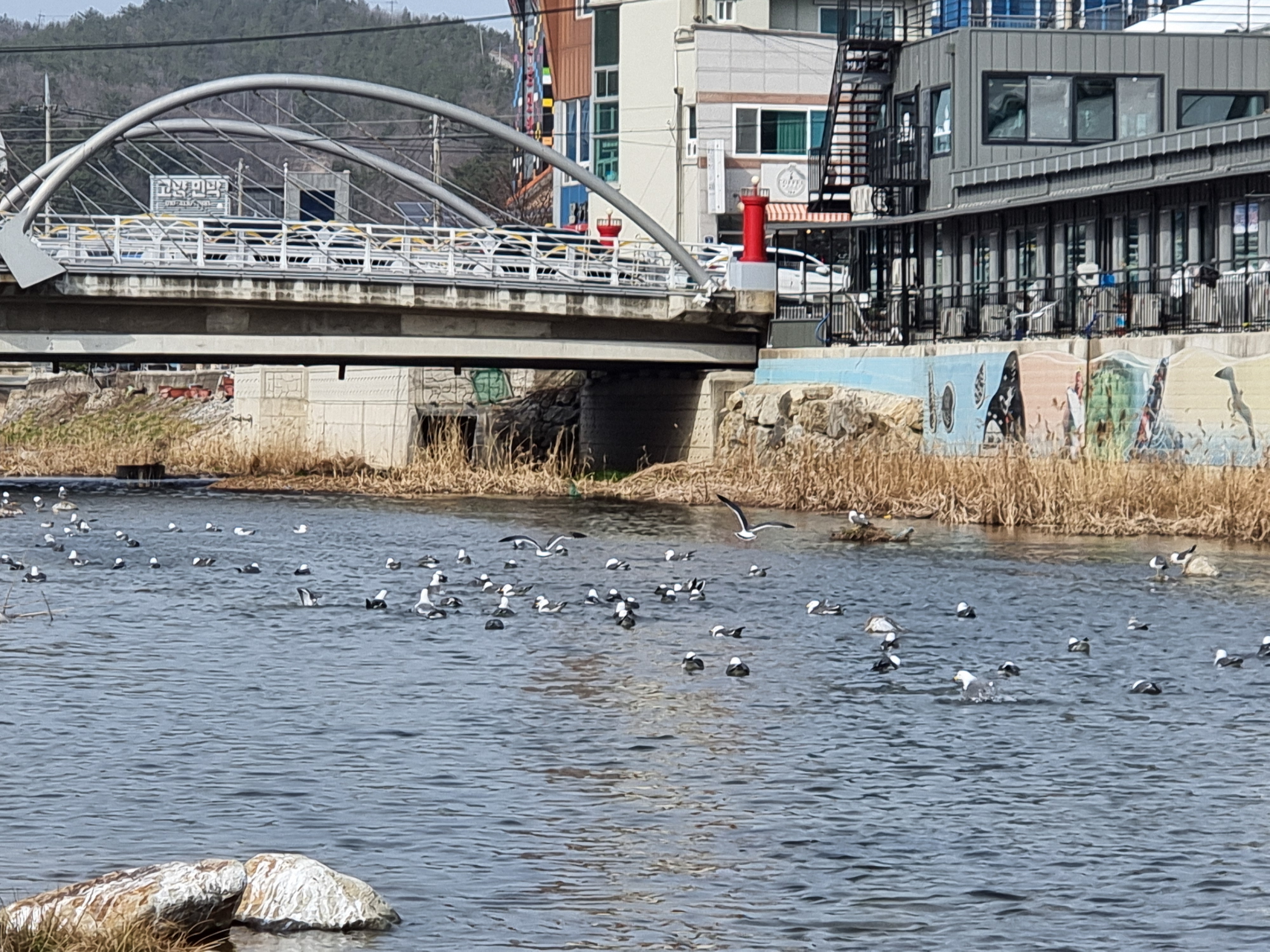 회센터 옆으로 흐르는 이 물이 바닷물 ㄱ같지는 않은데, 바다와 가까이 있어 갈매기들이 떼를 지어 놀고 있네요.