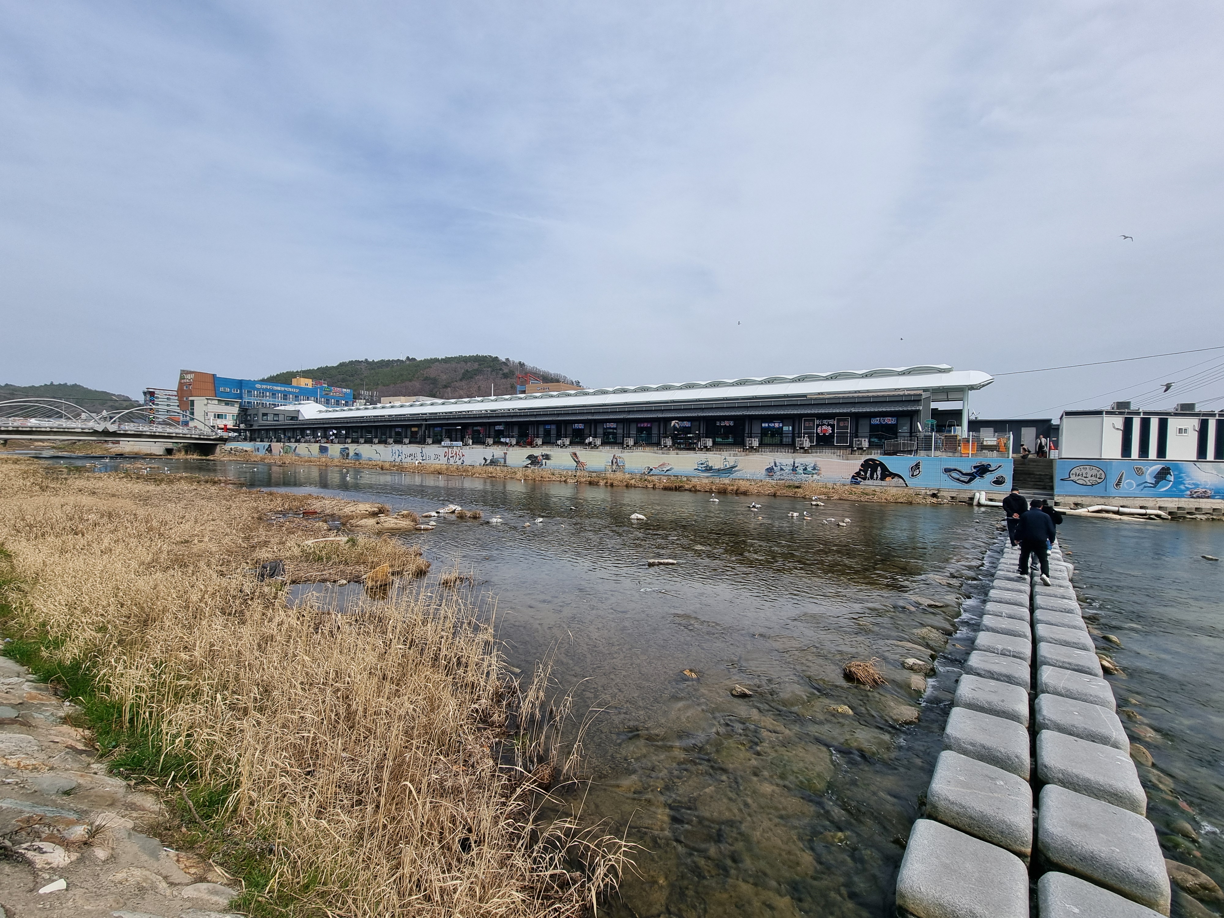 바로 들어가지 마시고, 우측 수로 옆에 주차를 하고 징검다리를 건너 활어회센터로 들어갑니다. 머리 위를 날아 다니는 갈매기와 빠른 유속에서 헤엄치는 물고기를 볼 수 있어 또 다른 운치를 선사합니다.