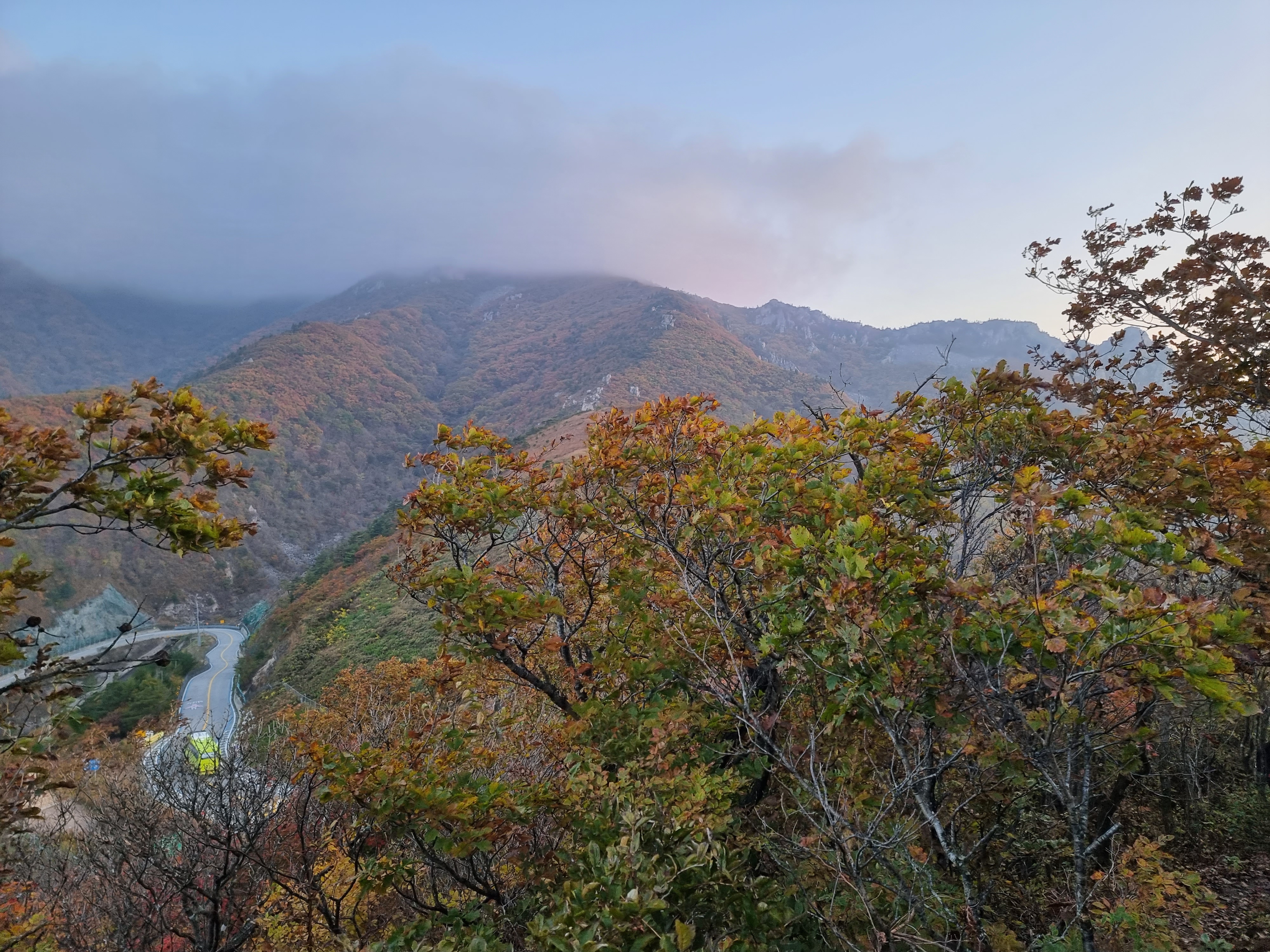 미시령이 굽이굽이 붉은 길을 만들어 주며 올라오고 있습니다.