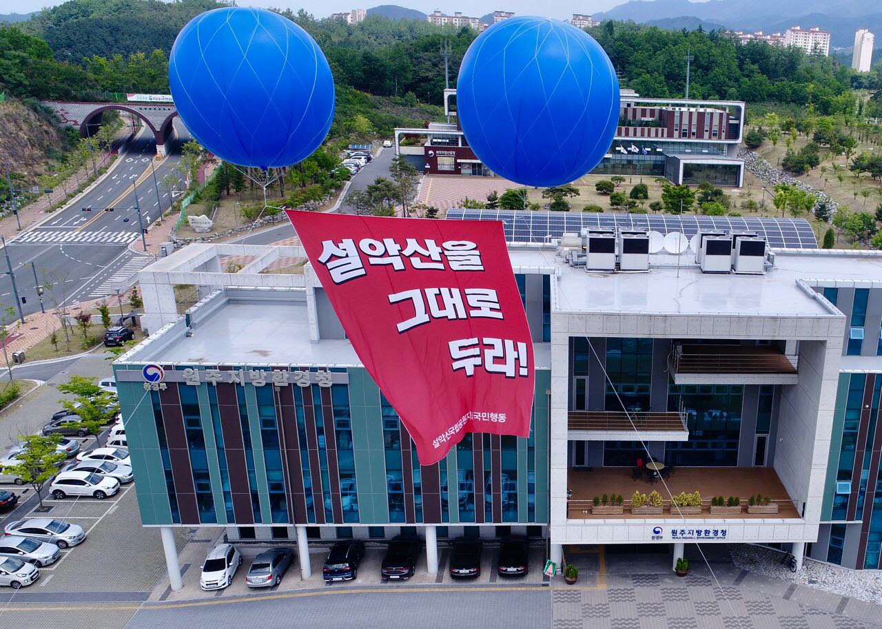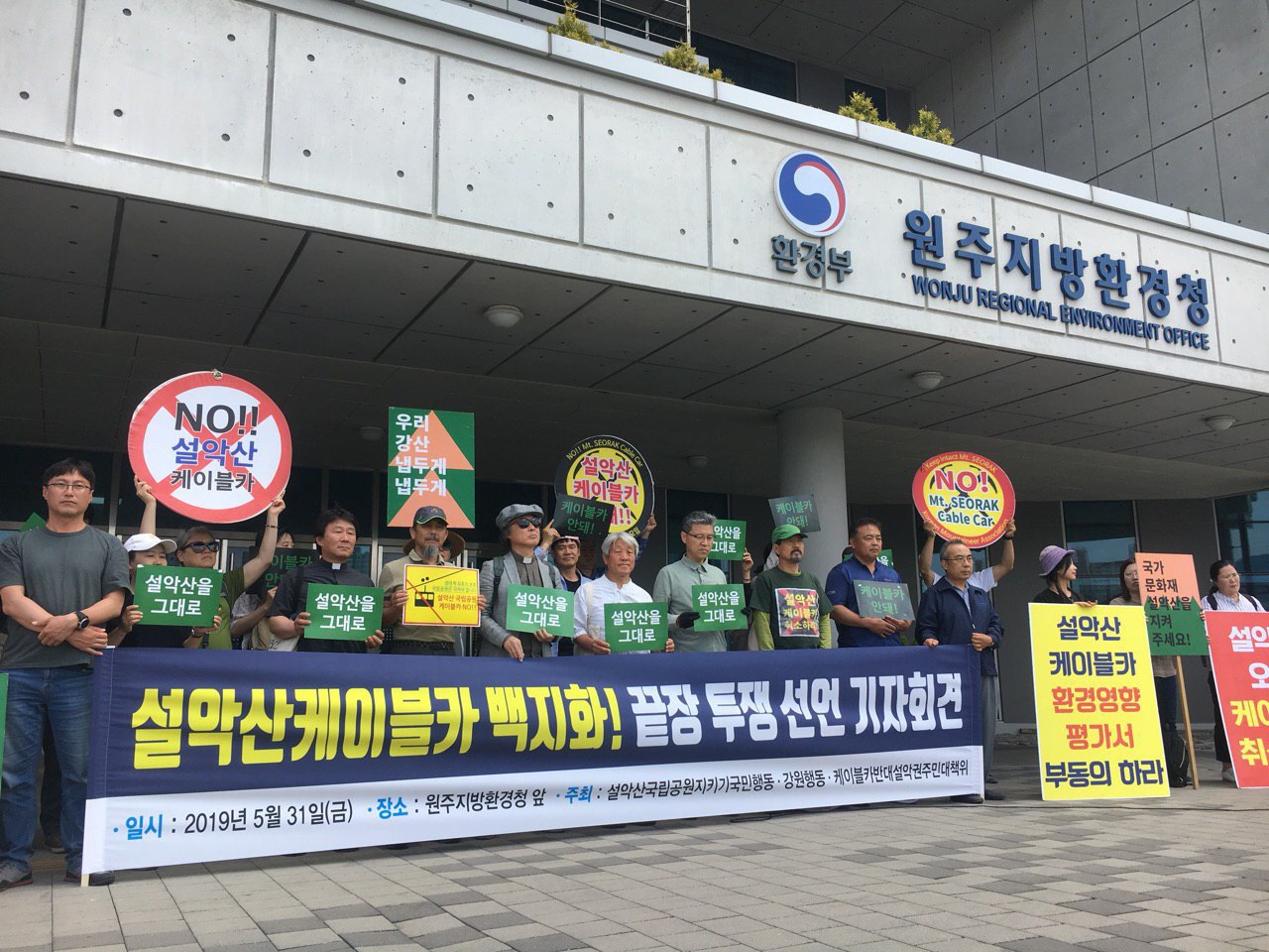 설악산국립공원지키기국민행동, 강원행동, 케이블카반대주민대책위는 환경영향평가 부동의로 그동안의 갈등과 논란이 종식돼야 한다고 판단하고 5월 31일 오전 11시 원주지방환경청 정문 앞에서 설악산케이블카 백지화 끝장투쟁 선언 기자회견을 진행했다.