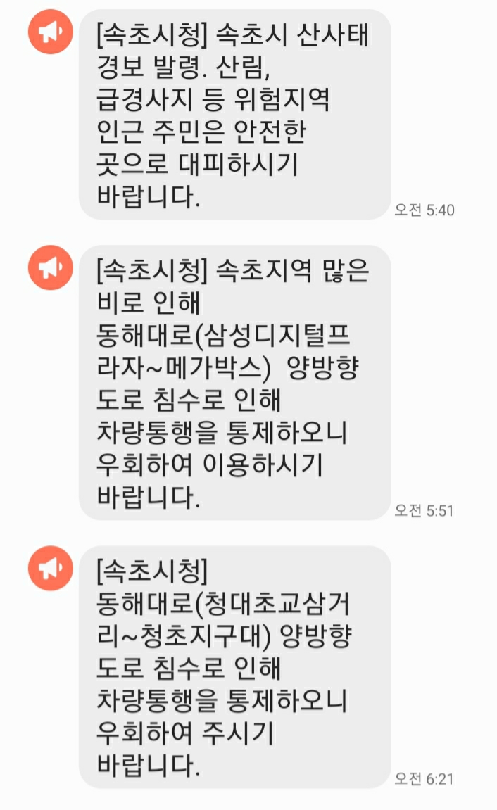 속초 쌍다리부터 아남프라자를 거쳐 청학 사거리까지 도로가 침수 되어 교통통제한다고 속초시청에서 문자도 오고, 텔레비젼 뉴스에서 전국전인 상황을 보고 있자니 괜히 심란해 집니다.