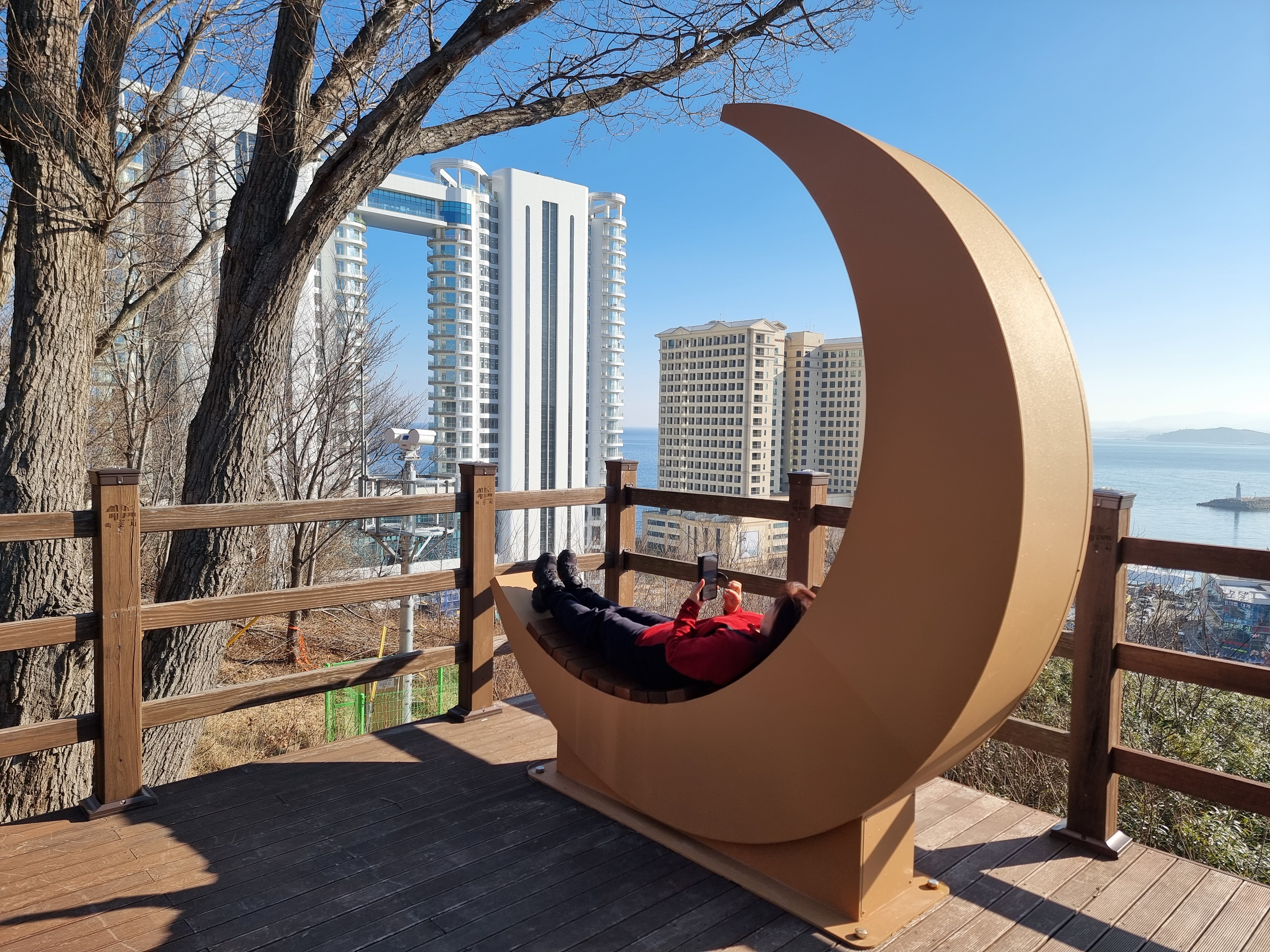 초승달 조형물에 휴식을 취할 수 있게 만들어 놓았네요. 바다를 보며 시원스레 여유있는 시간을 보낼 수 있습니다.
