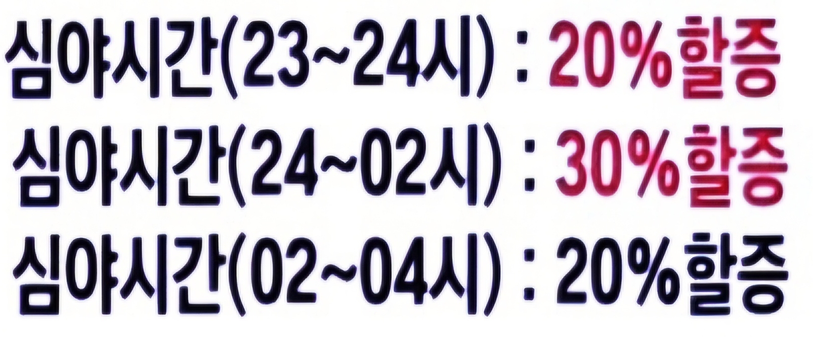 23시부터 04시까지 할증시간인데요. 시간별로 할증요율 차이가 있습니다.