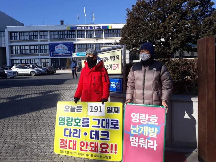 〇 영랑호생태탐방로조성사업은 자연호수 석호의 수면을 가로지르는 부잔교와 야간조명으로 호수 생태계를 파괴하고 주민들의 휴식처를 빼앗는 사업입니다. 이에 지난해 7월부터 시민들은 반대운동을 진행하고 있으며, 지난해 12월까지 총 8천여 명이 서명했습니다.