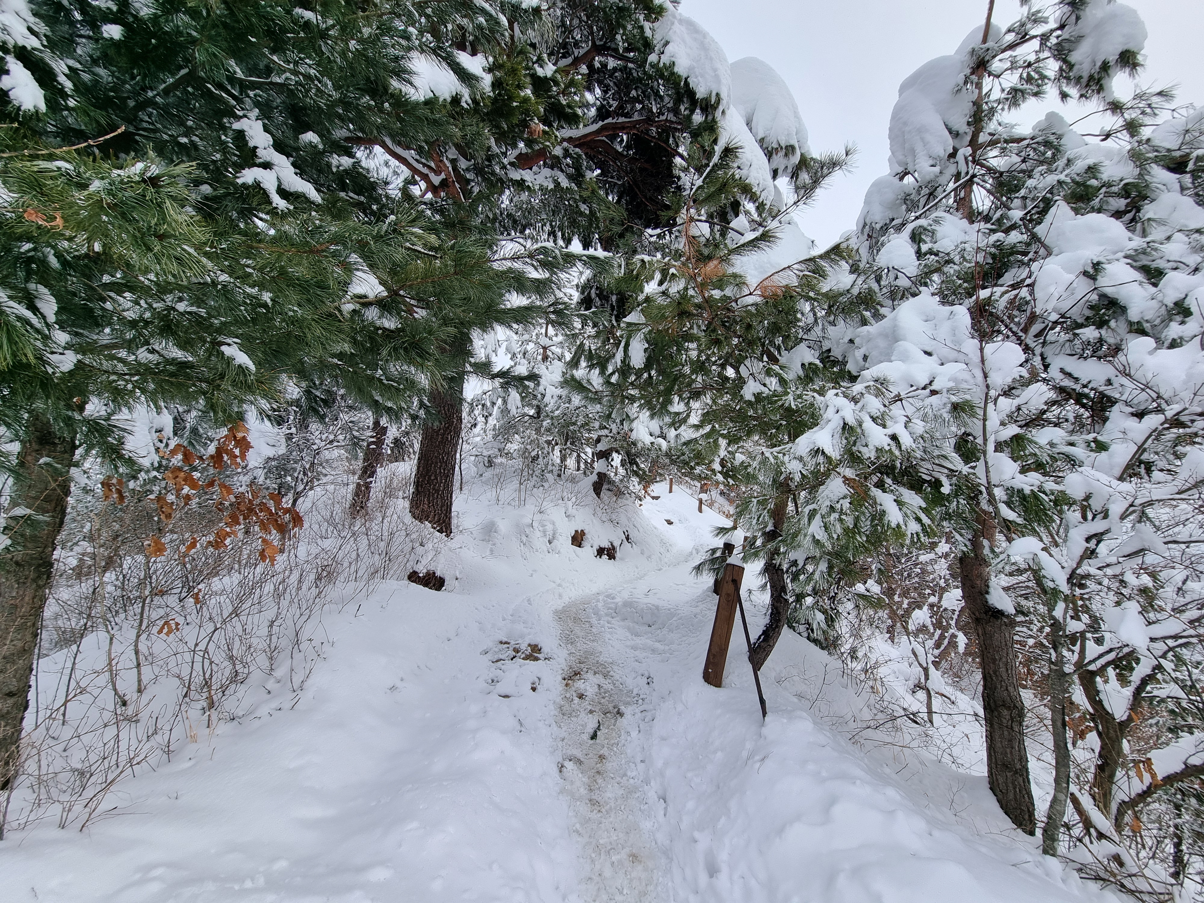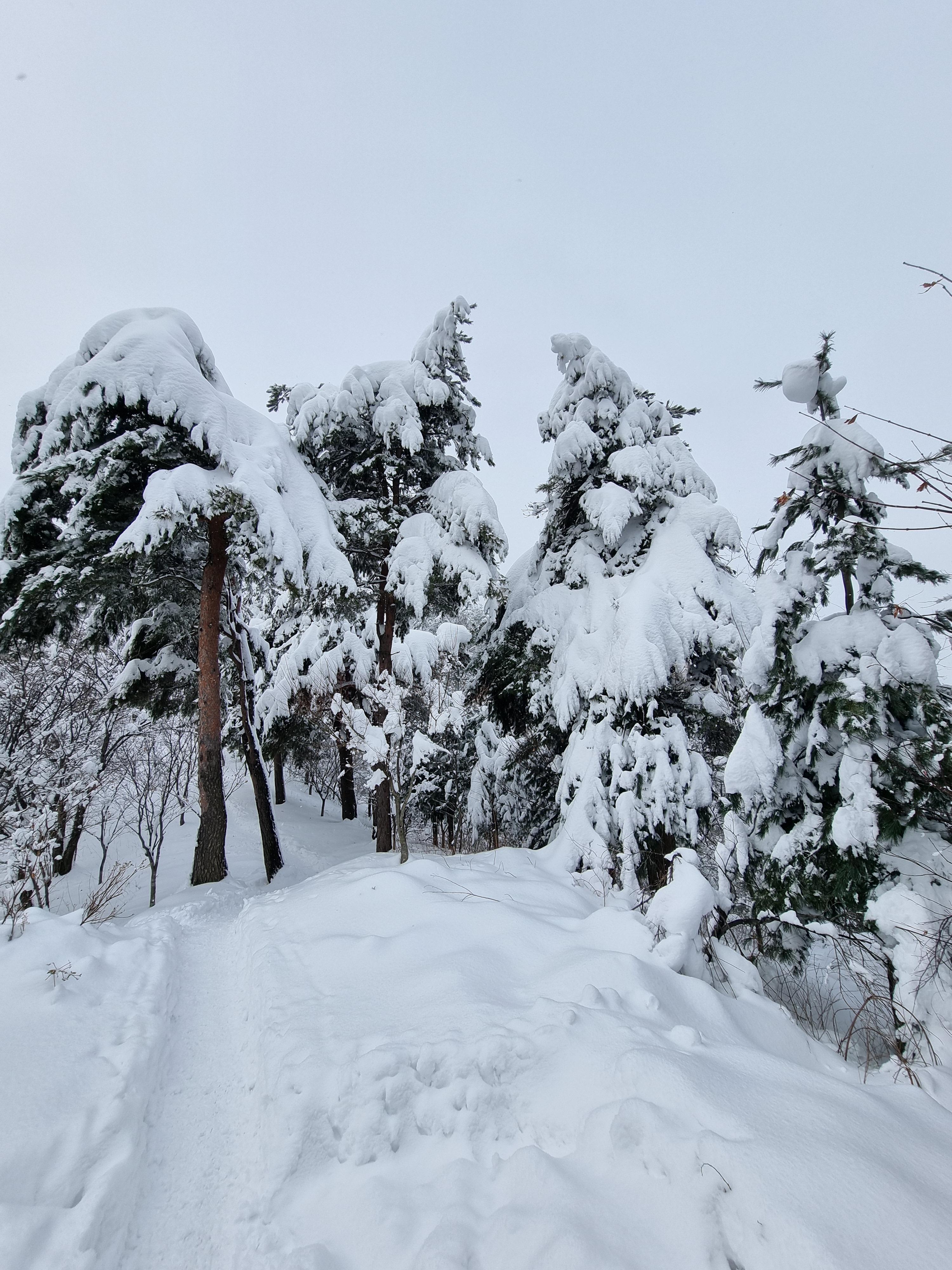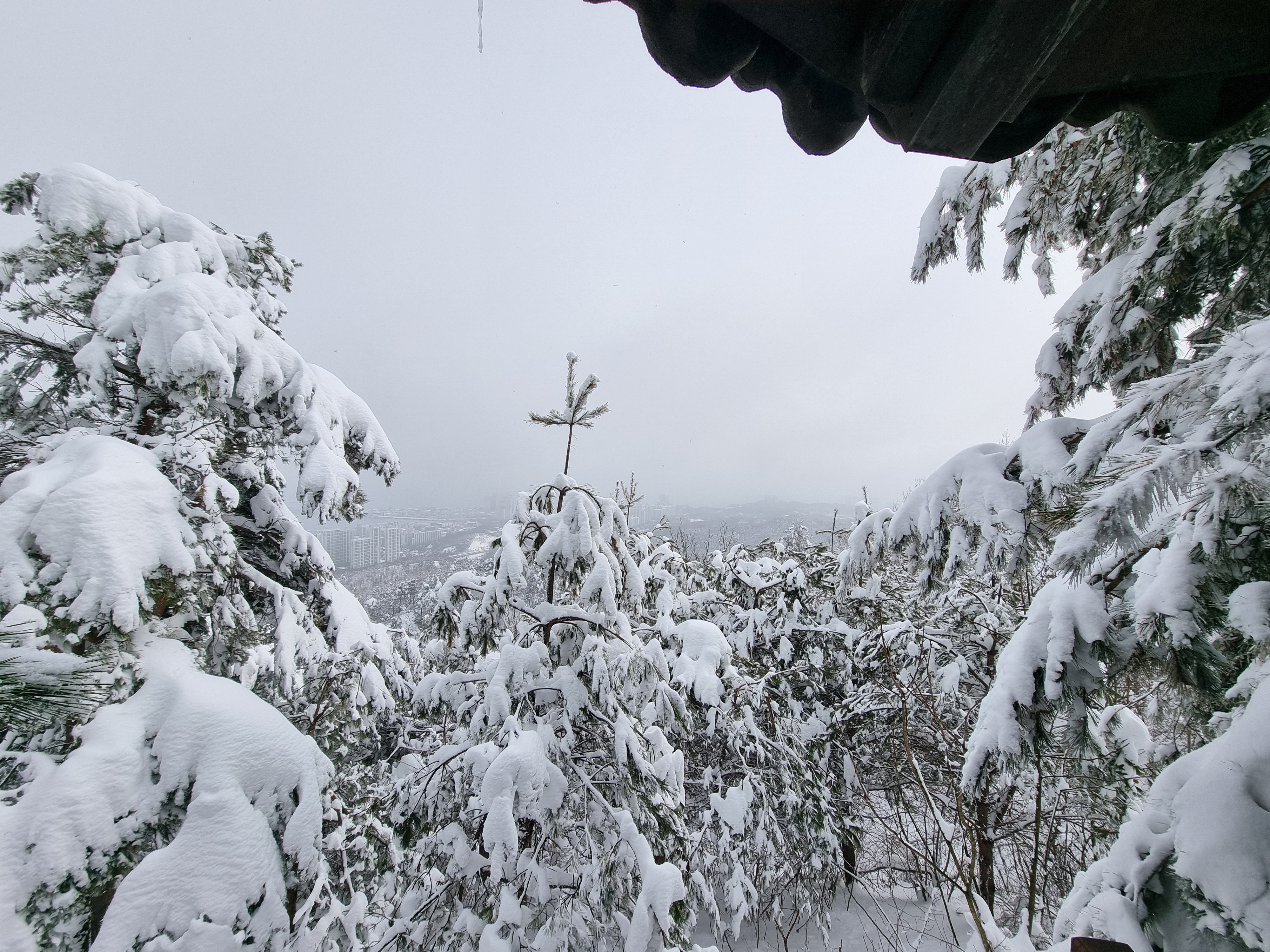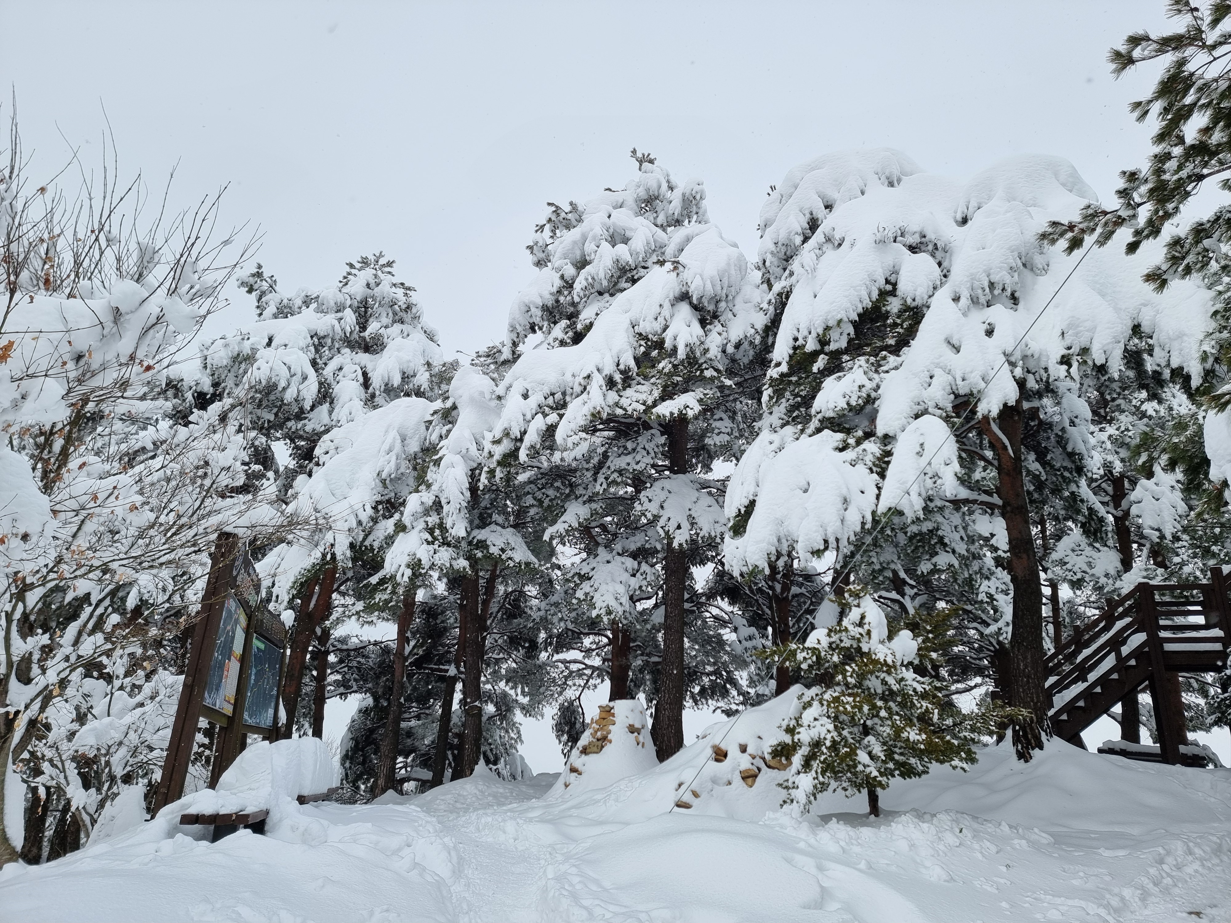 정상 소나무들이 하얗게 변장을 하고 정자를 감싸고 있어 비밀스러운 장소처럼 느껴집니다.