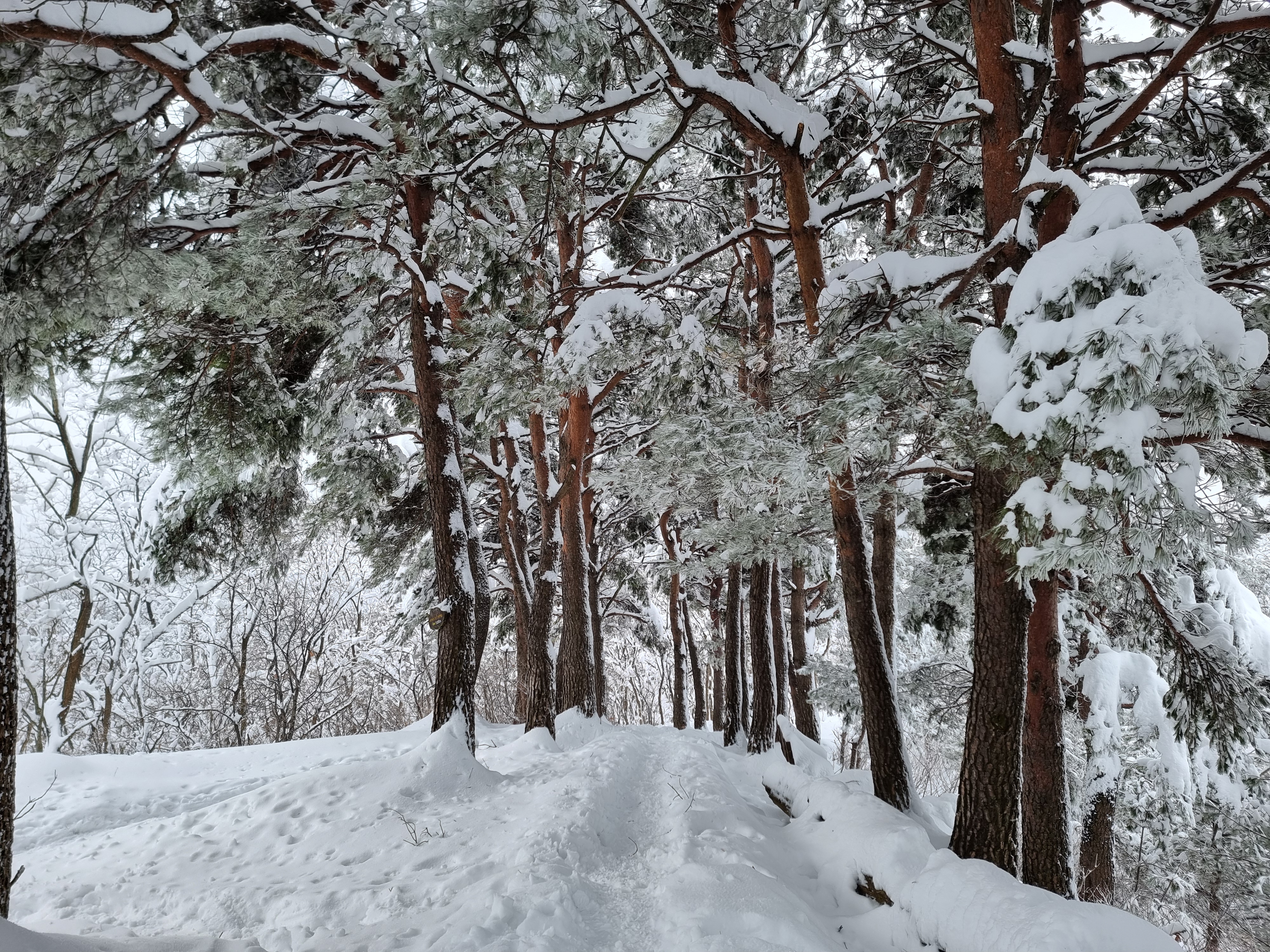 소나무 가지가지마다 하얀눈이 달라붙어 무게를 이기지 못해 가지들이 쭉쳐저 힘들어 보이네요.