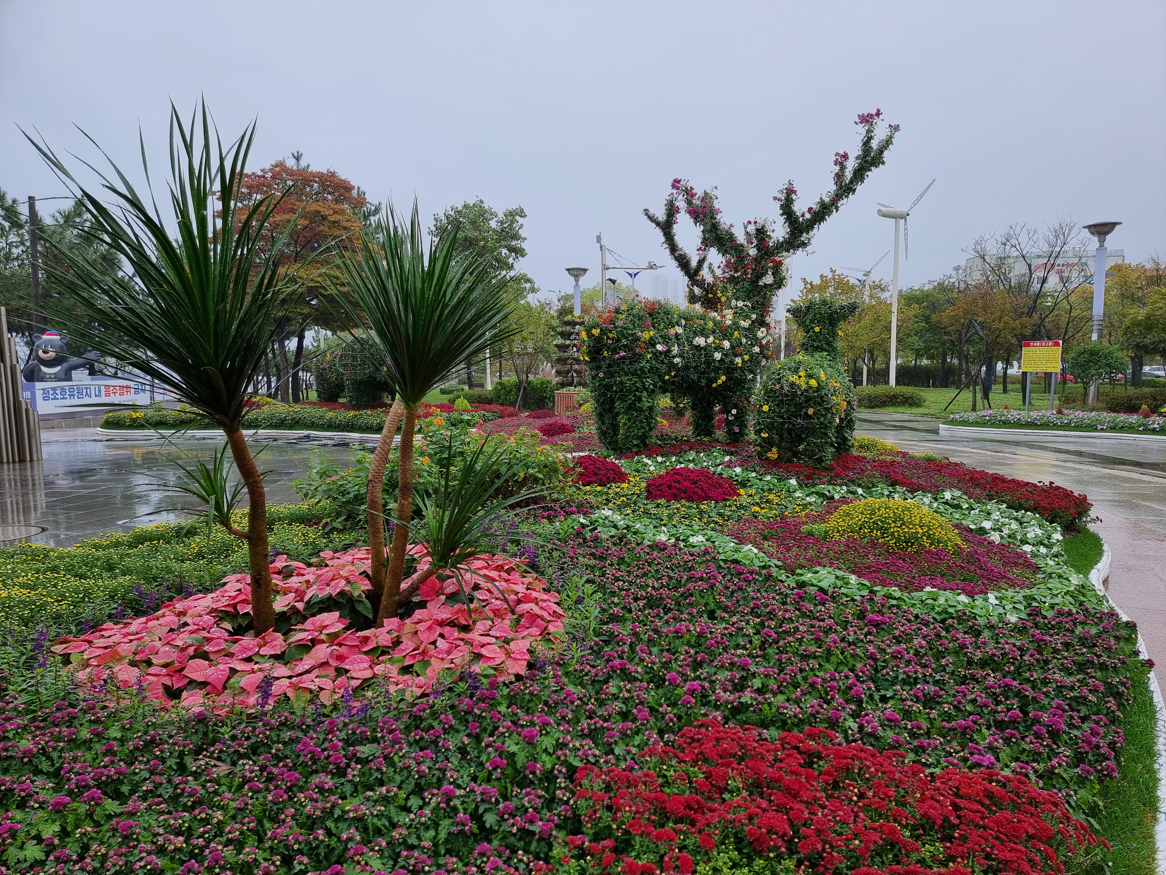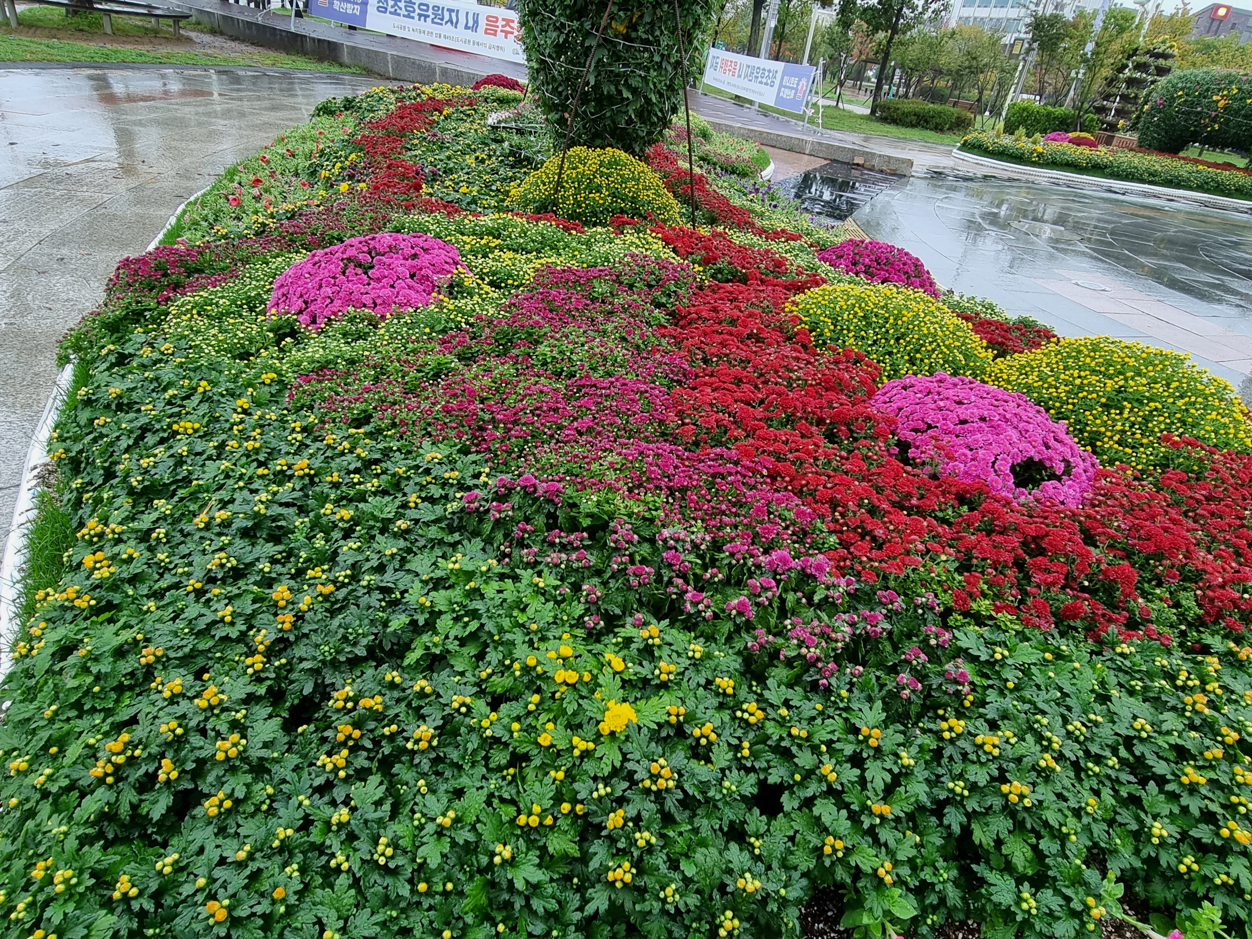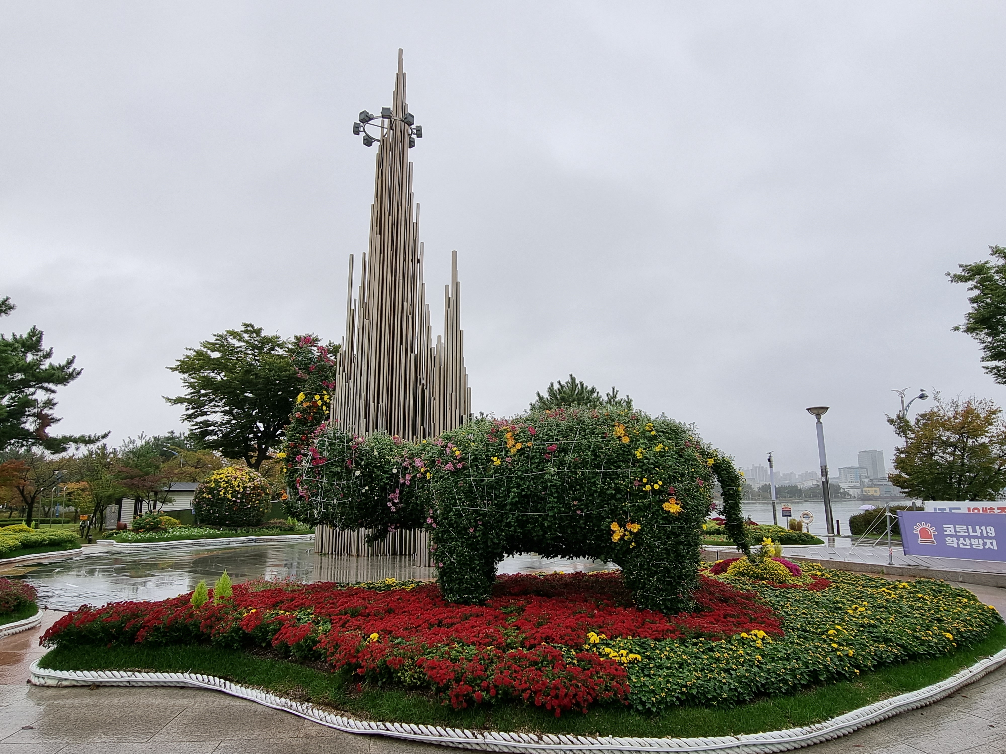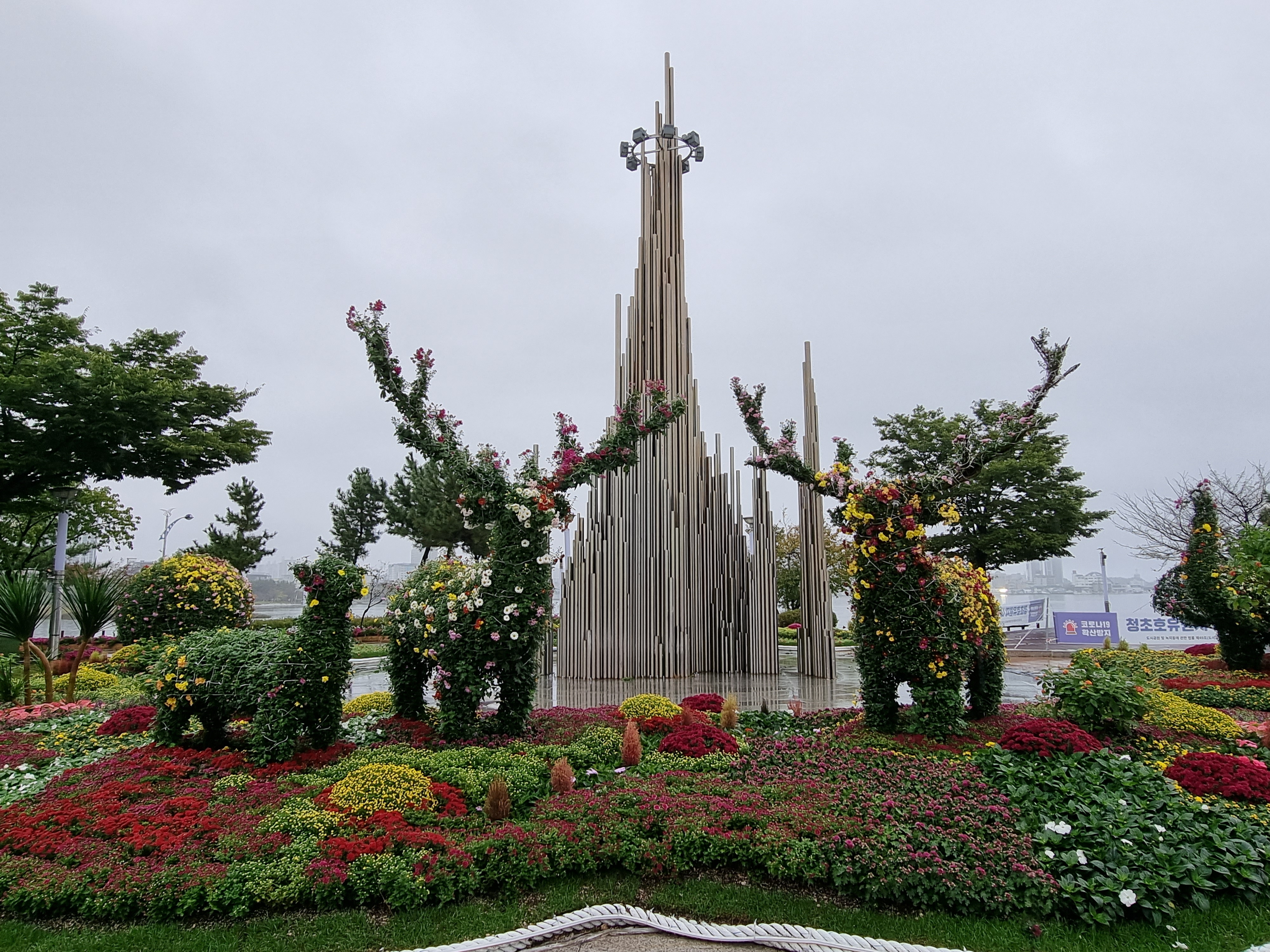 청초호수공원에 있는 조형물입니다. 주위에 국화꽃으로 단장하여 국화꽃으로 만든 조형물이 멋지게 자리를 잡고 있습니다.