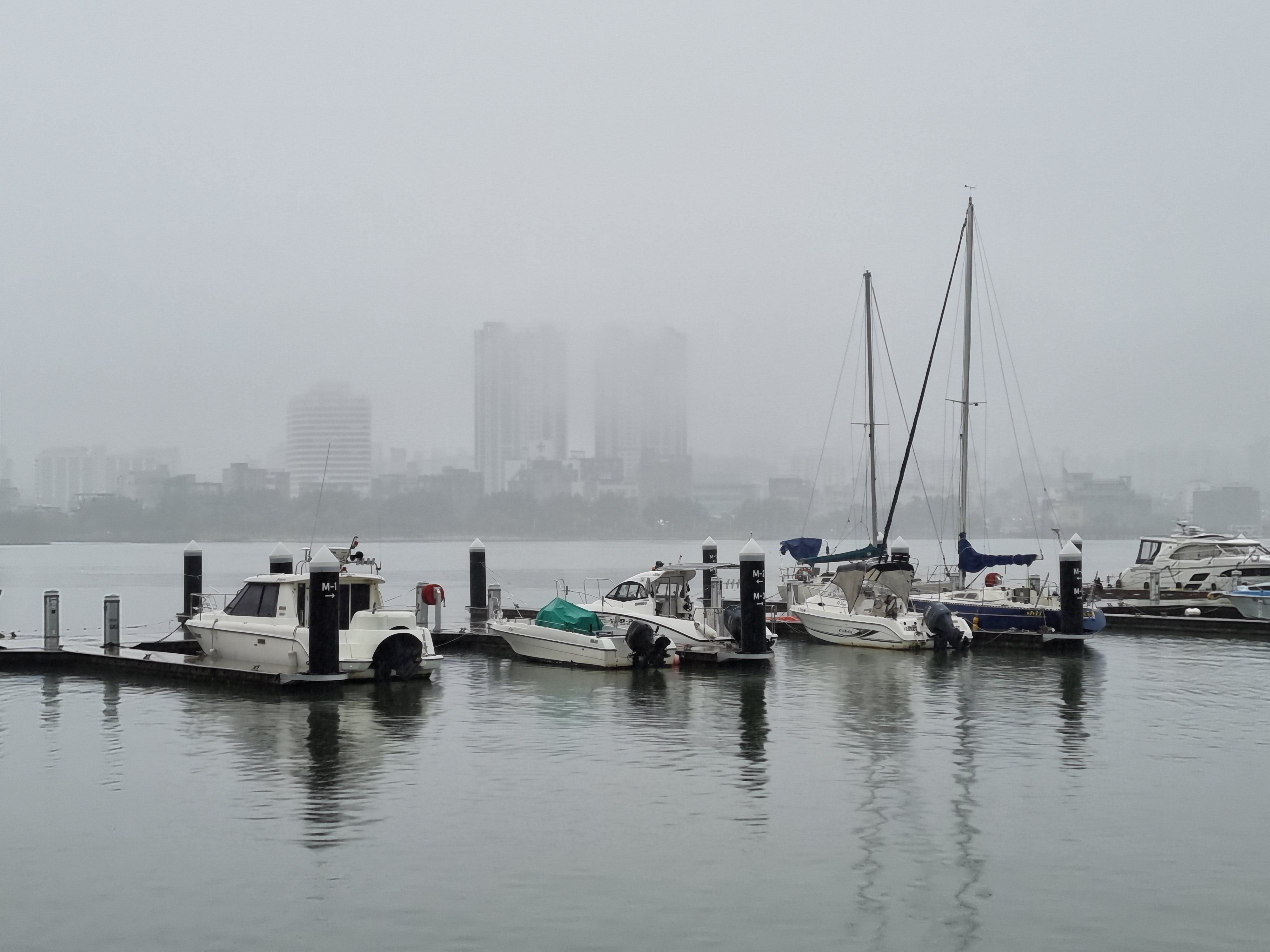 꼭 눈이 오는 것 같은 느낌이 듭니다. 보트 정박장에 보트들이 정박해 있습니다.