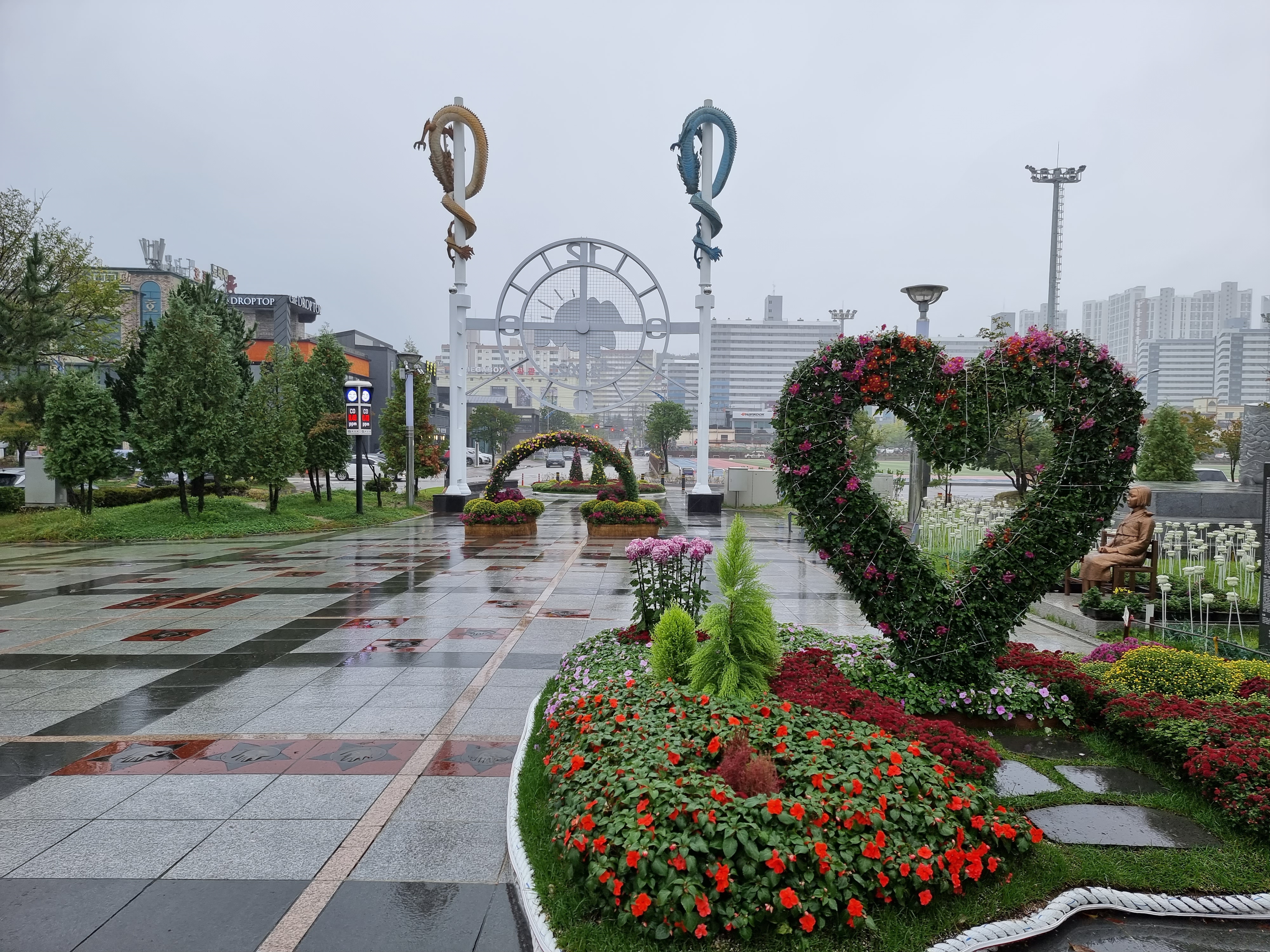 청초호수공원에 있는 조형물입니다. 주위에 국화꽃으로 단장하여 국화꽃으로 만든 조형물이 멋지게 자리를 잡고 있습니다.
