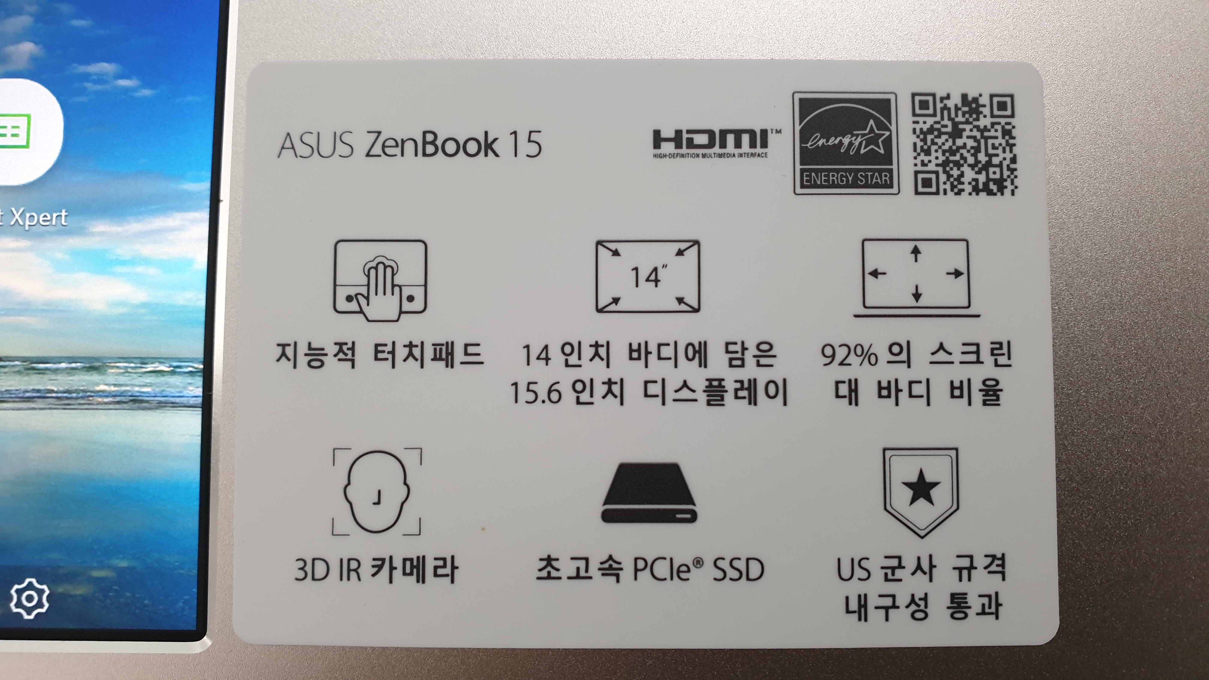 아수스 노트북 젠북 특성에 대한 것을 스틱커로 붙여 놓았네요.