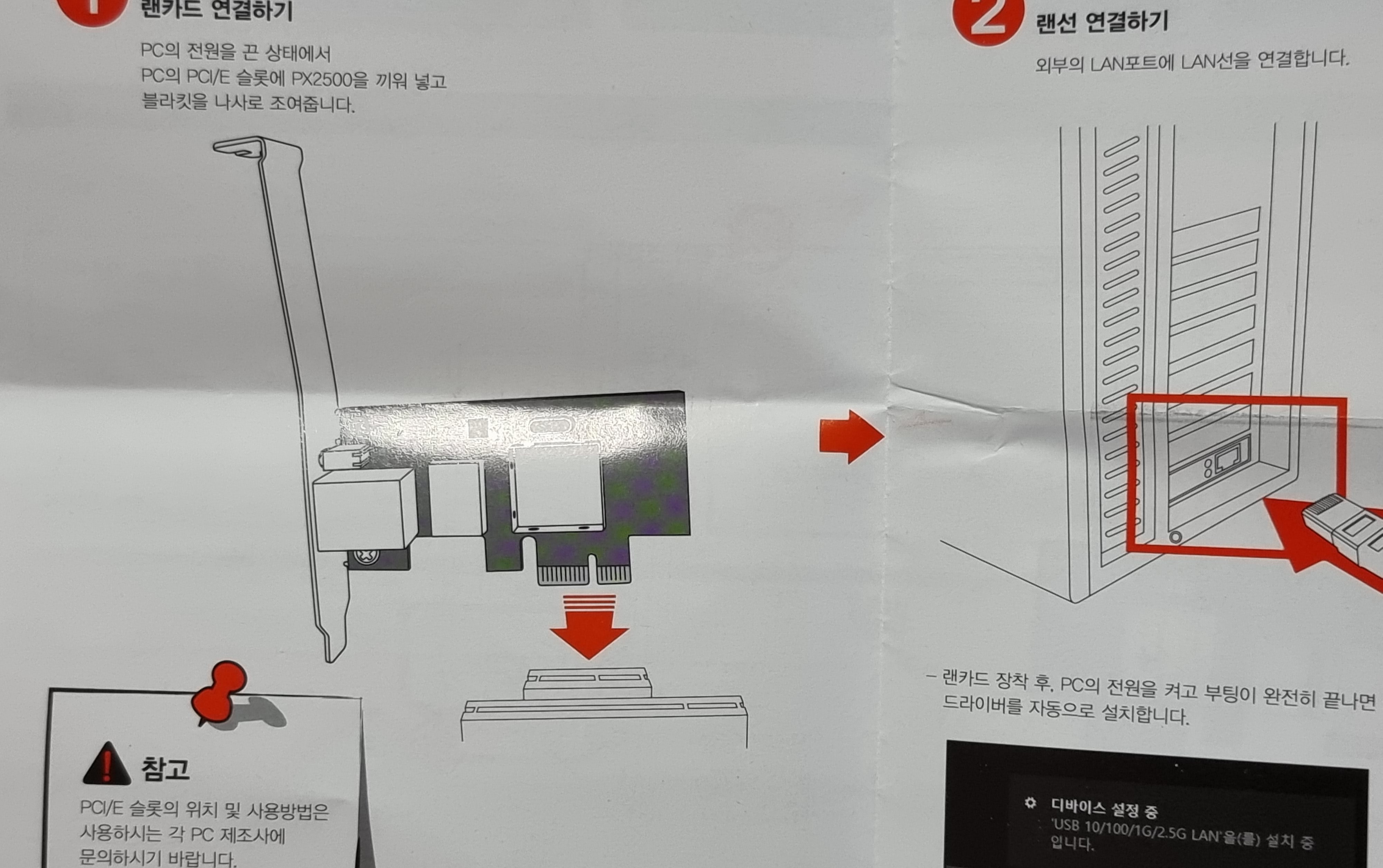 열어보니, 랜카드가 비닐봉투에 싸여 있고, 슬림 피씨에서도 사용할 수 있게 작은 LP브라킷, 사용 설명사가 들어 있습니다.