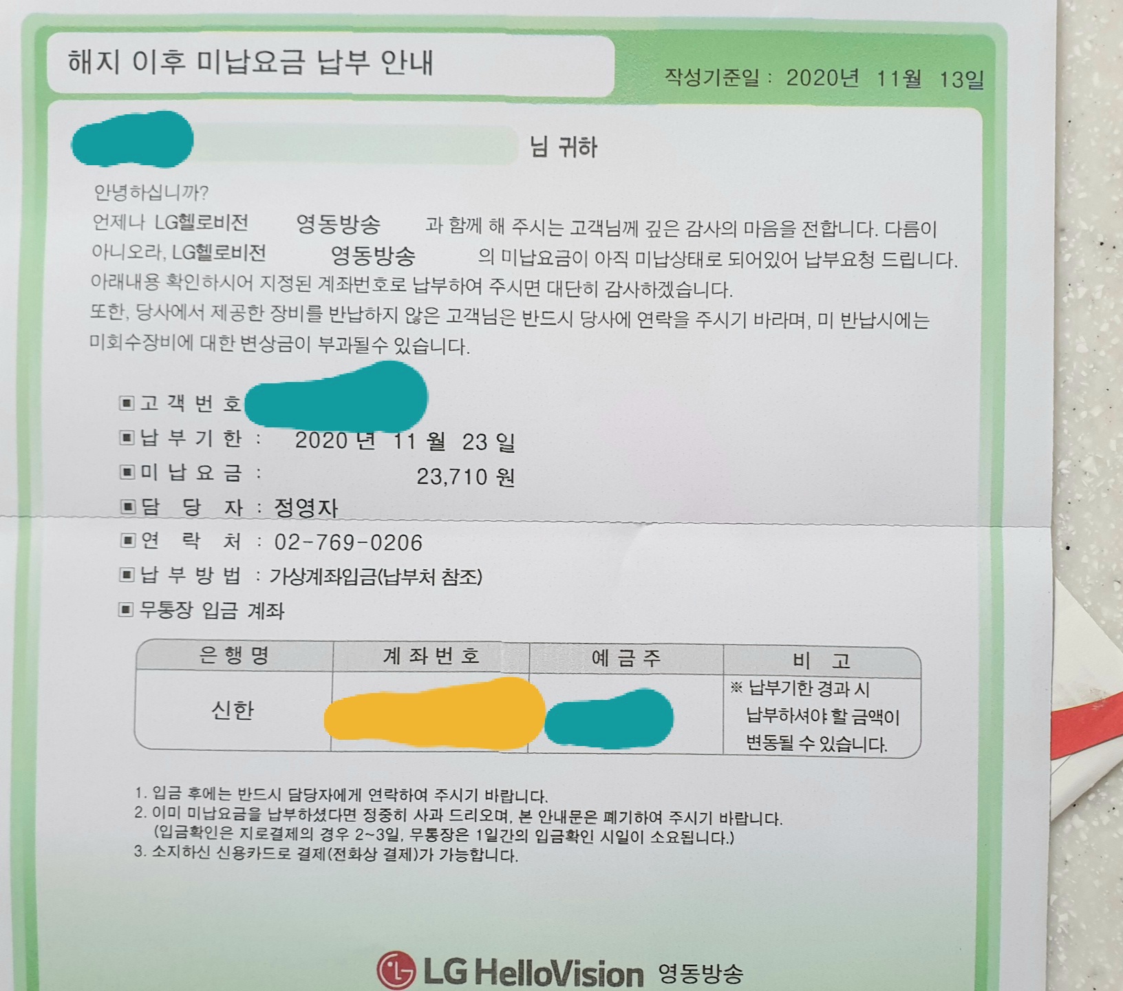 이사를 하고 약 3달 있다가 엘지헬로비전 영동방송에서 미납요금 우편이 날아옵니다.