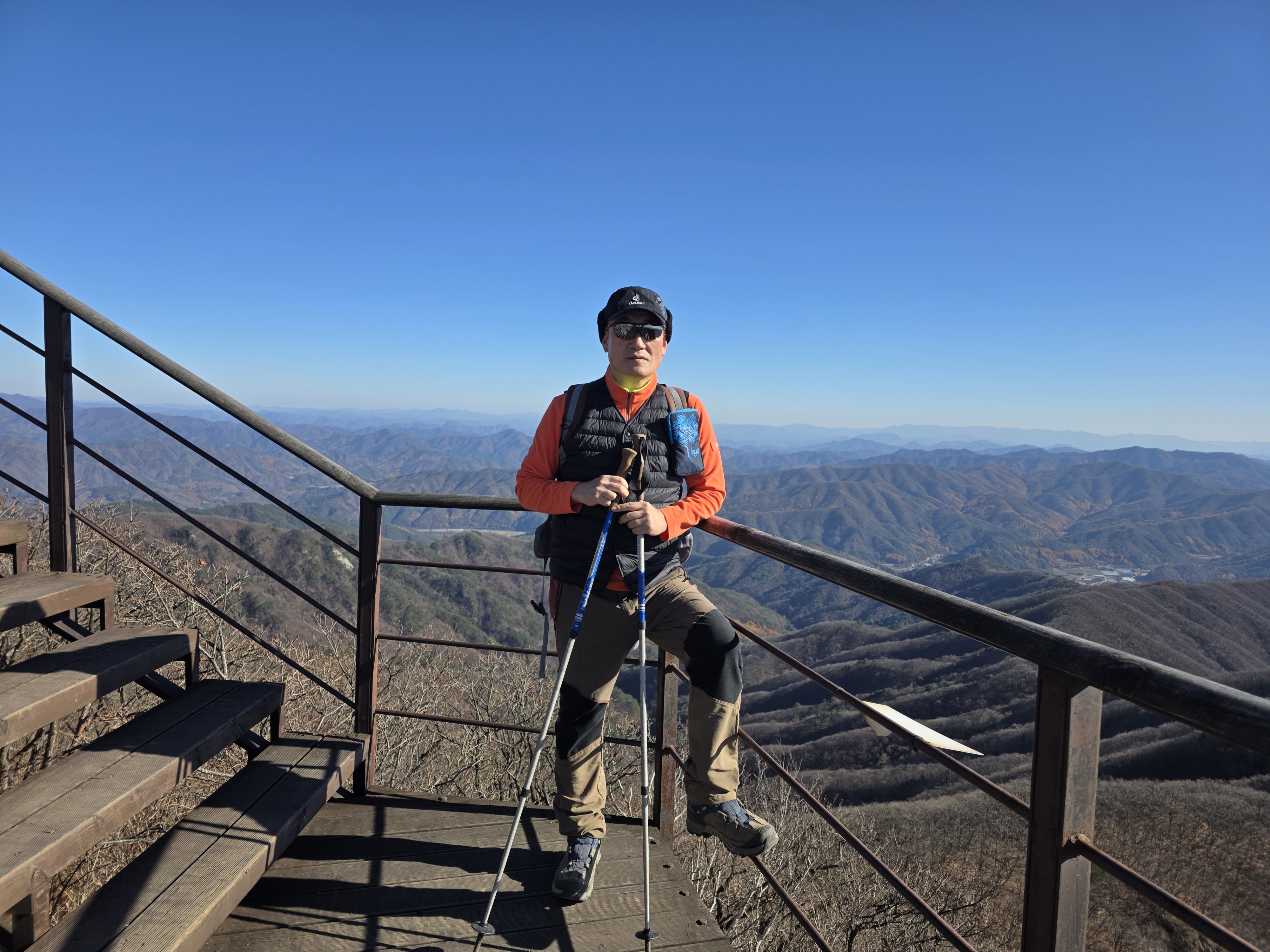 중턱에 오르자 단풍잎은 거의 떨어졌지만, 나뭇가지 사이로 보이는 파란 하늘이 한 폭의 그림 같더군요. 능선길에 서니 원주 시내와 멀리 소금산까지 시야가 탁 트였습니다. 늦가을의 투명한 공기 덕분에 시야가 정말 좋았네요.