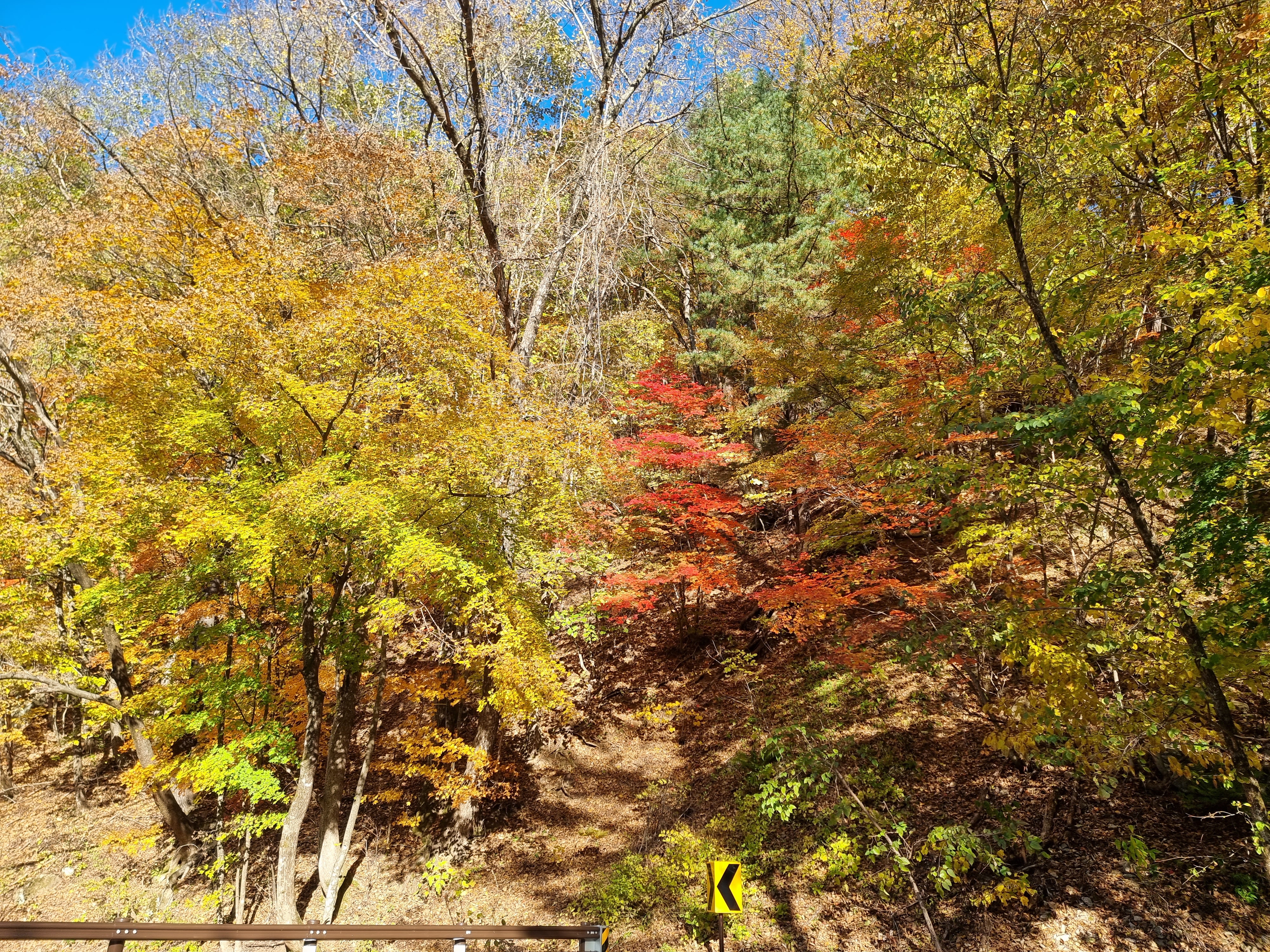 단풍이 곱게 물들어 무척 아름답네요. 버스를 타고 가면 훅 지나갈 것을 눈이 시리도록 보면 걷고 있습니다.