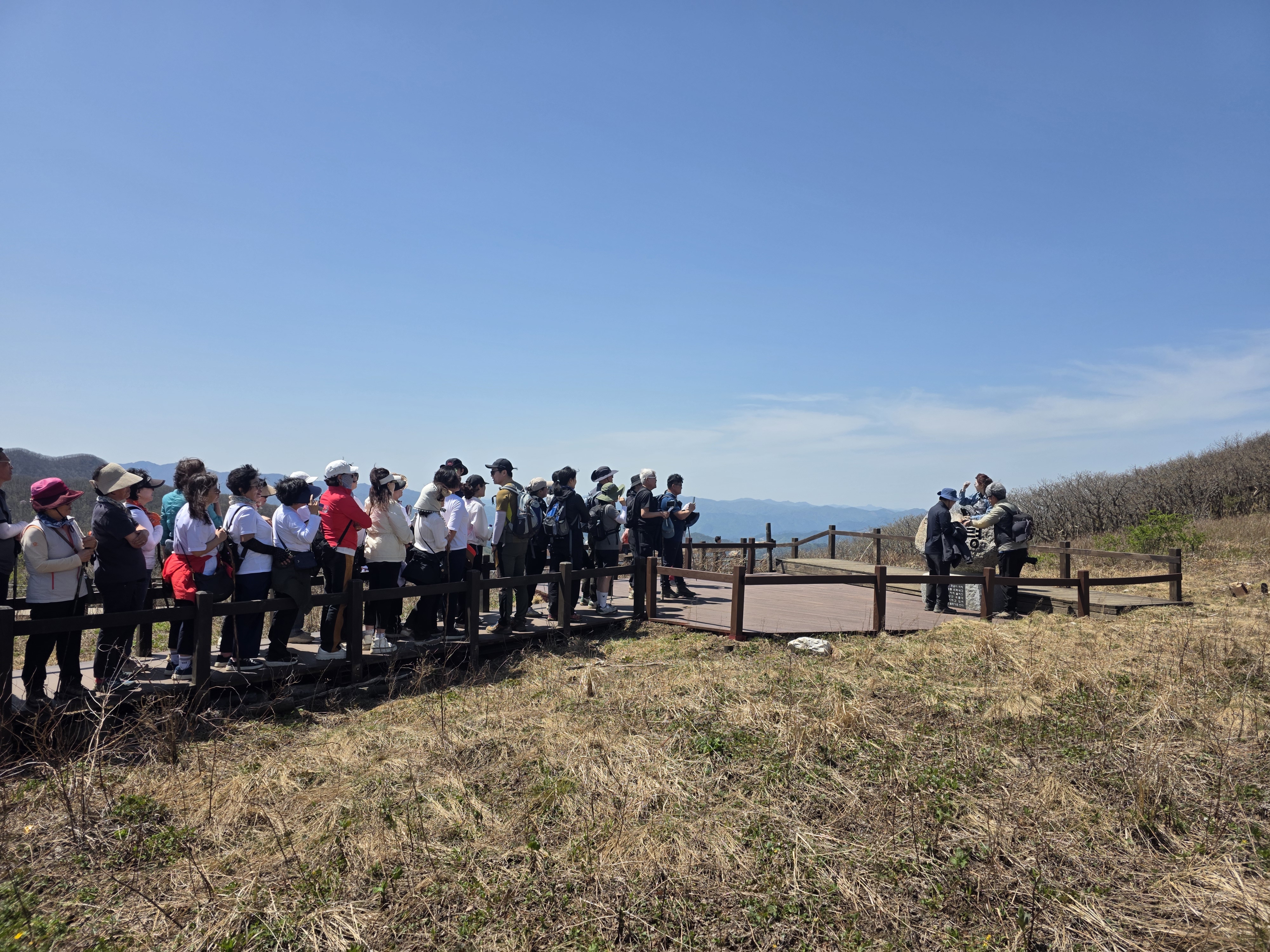 정상에 도착하면 곰배령의 시그니처인 나무 데크길이 펼쳐집니다. 곰의 배를 닮았다고 해서 붙여진 이름이라는데, 넓게 펼쳐진 초원을 보고 있으면 가슴이 뻥 뚫리는 기분이에요. 여기서 찍는 인증샷은 무조건 '인생샷' 확정입니다! 📸