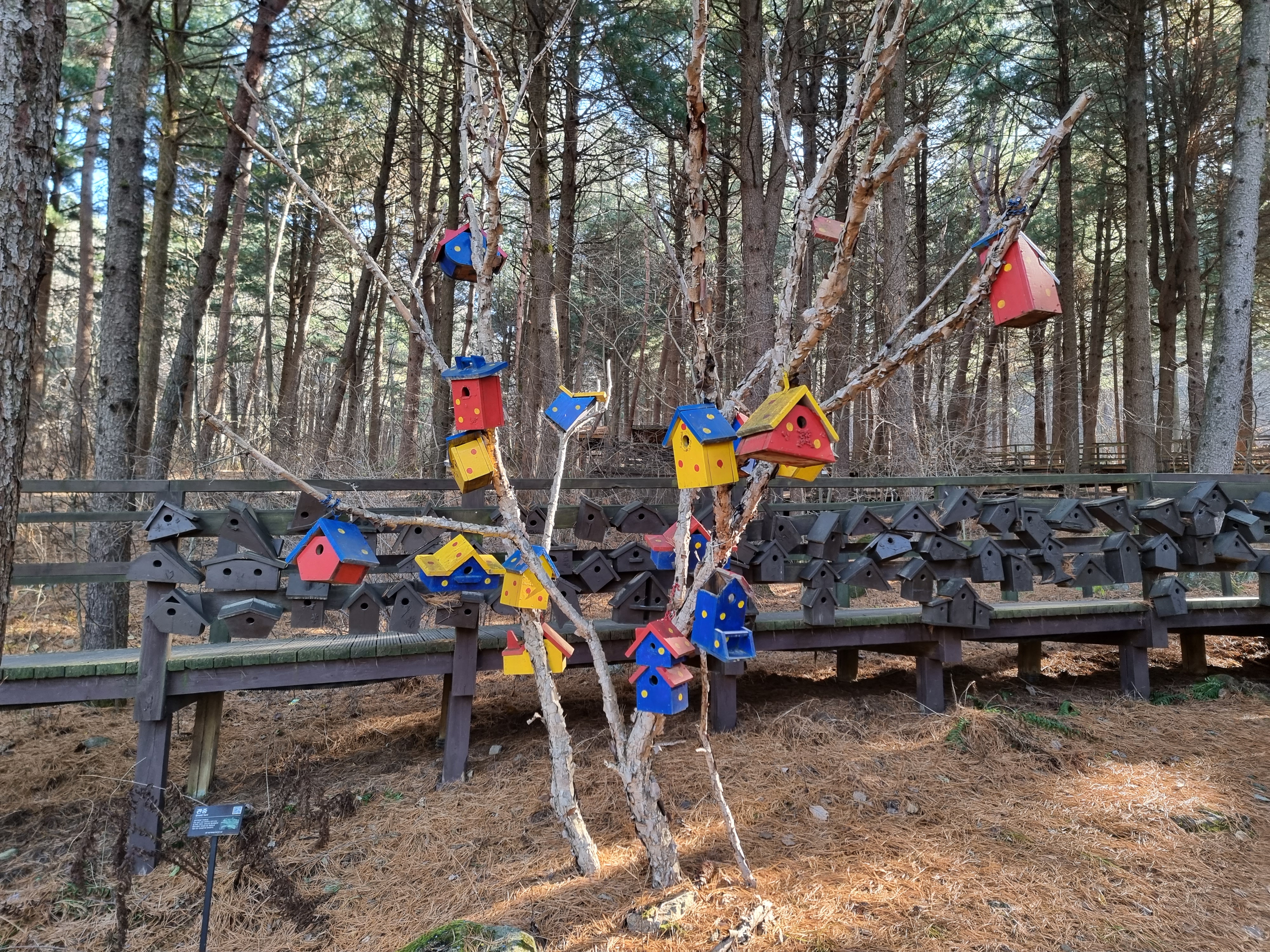 3등산로로 오면 처음 출발한 곳과 만나게 됩니다. 나뭇가지와 데크길 옆에 예쁘게 조형물을 만들어 걸어 놓거나 붙여 놓았는데요. 새집이네요.