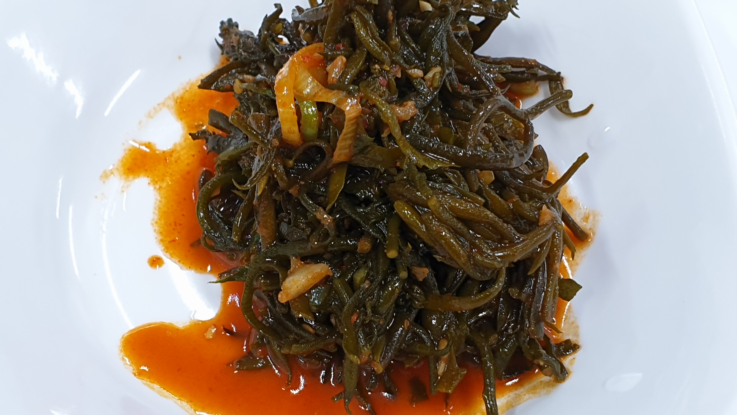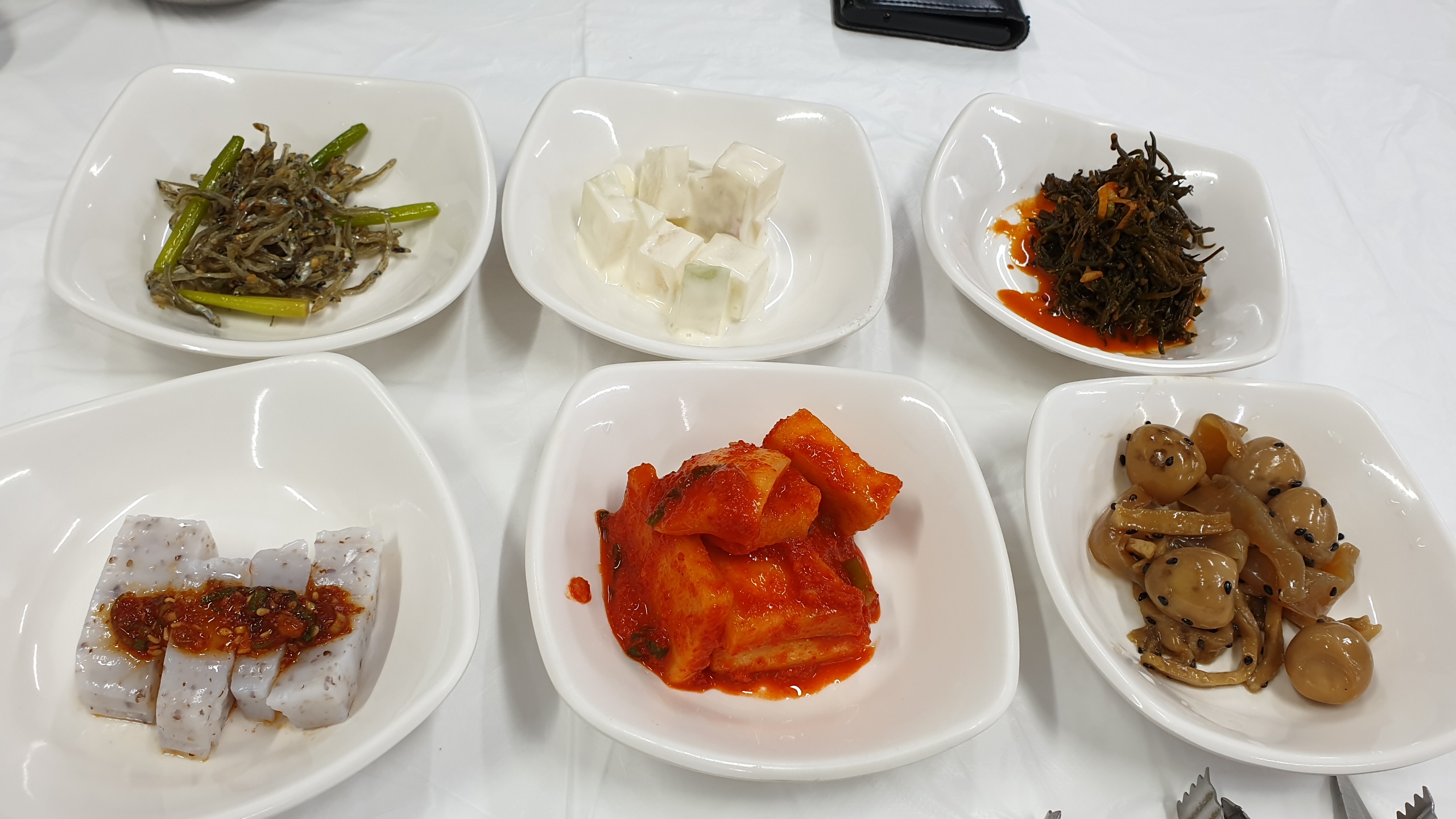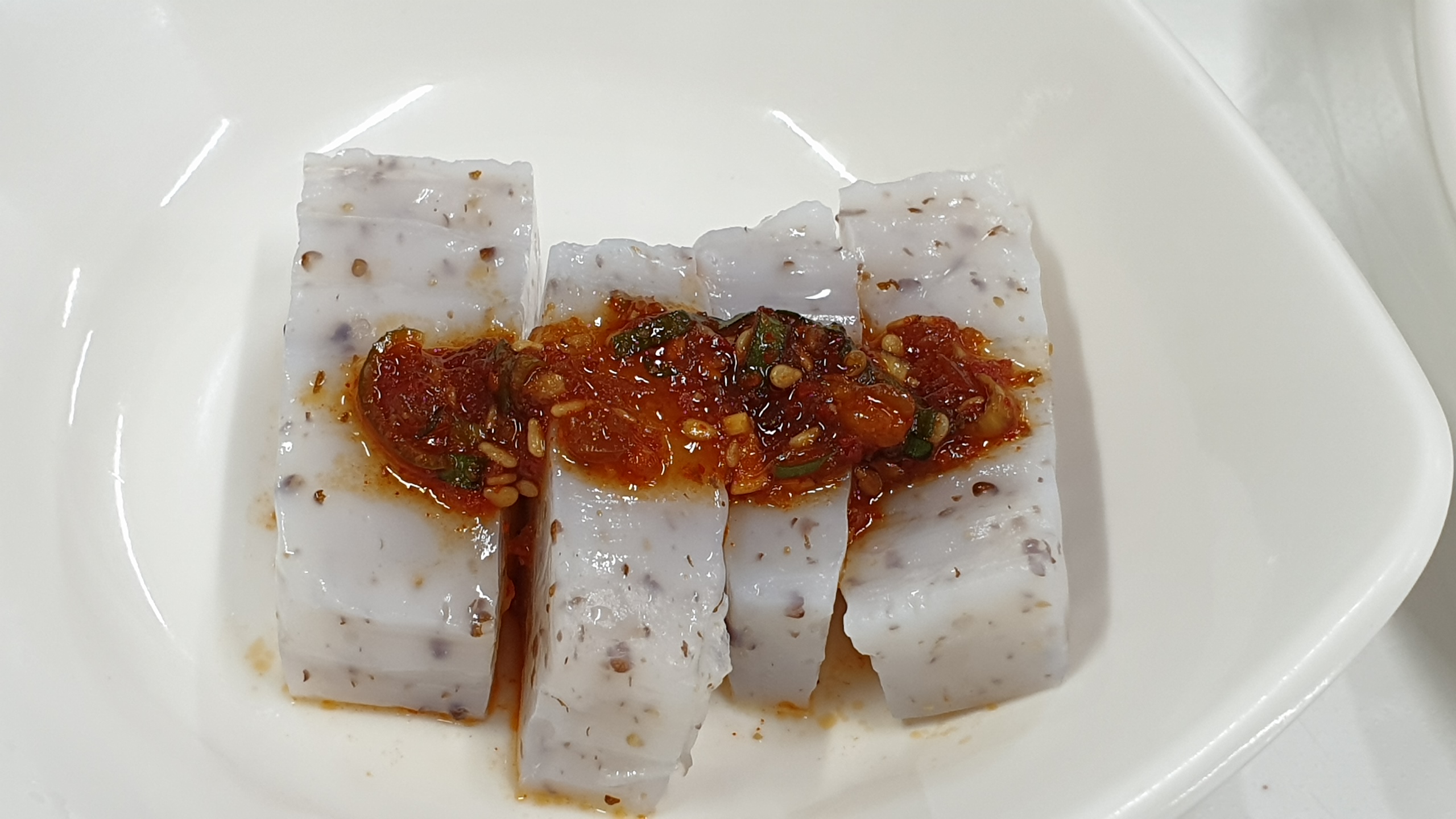 멸치 볶음,과일 사라다(이건 후식으로 먹어야),톳나물,묵종류인데 바다풀로 만든 뭐 이름은 모르겠구요.투박하게 썰어 만든 깍두기, 메추리알로 만든 반찬인데, 이것 또한 이름을..