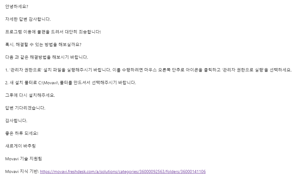 2) 새 설치 폴터로 C:\Movavi\ 폴터를 만드셔서 선택해주시기 바랍니다. 그후에 다시 설치해주세요.