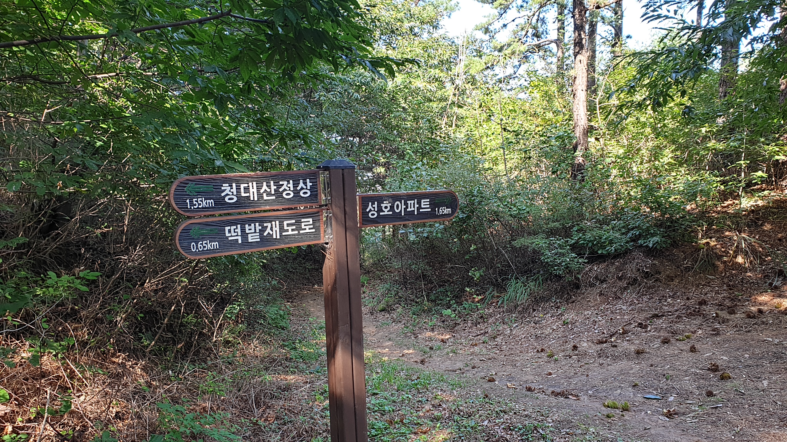 우측으로 가면 떡밭재를 지나 1.55km로 가면 청대산 정상에 갈 수 있는 길입니다.