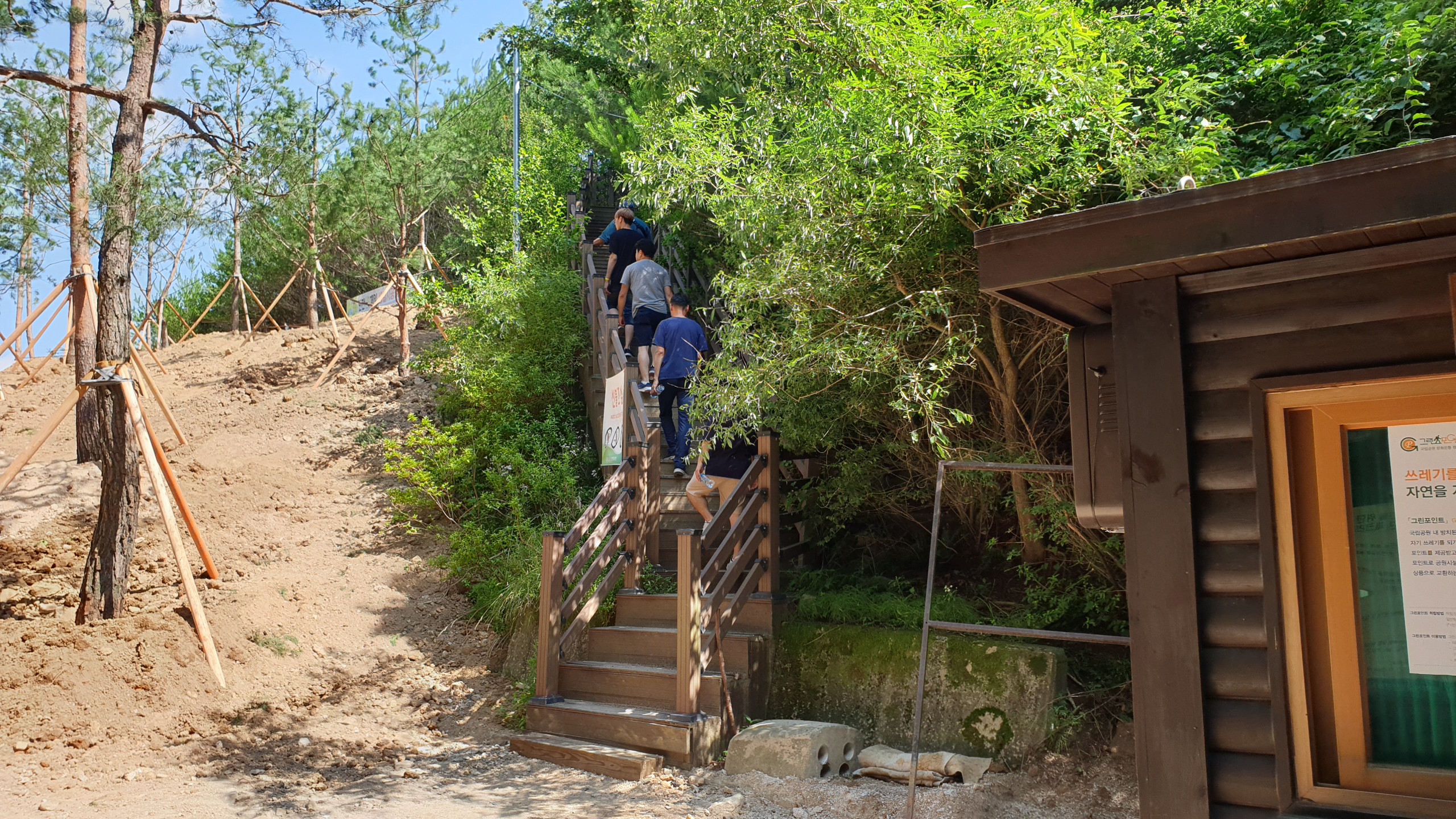 탐방지원 안내소 옆을 돌며 하늘재로 오르는 나무 테크로 만들어진 계단을 오릅니다.