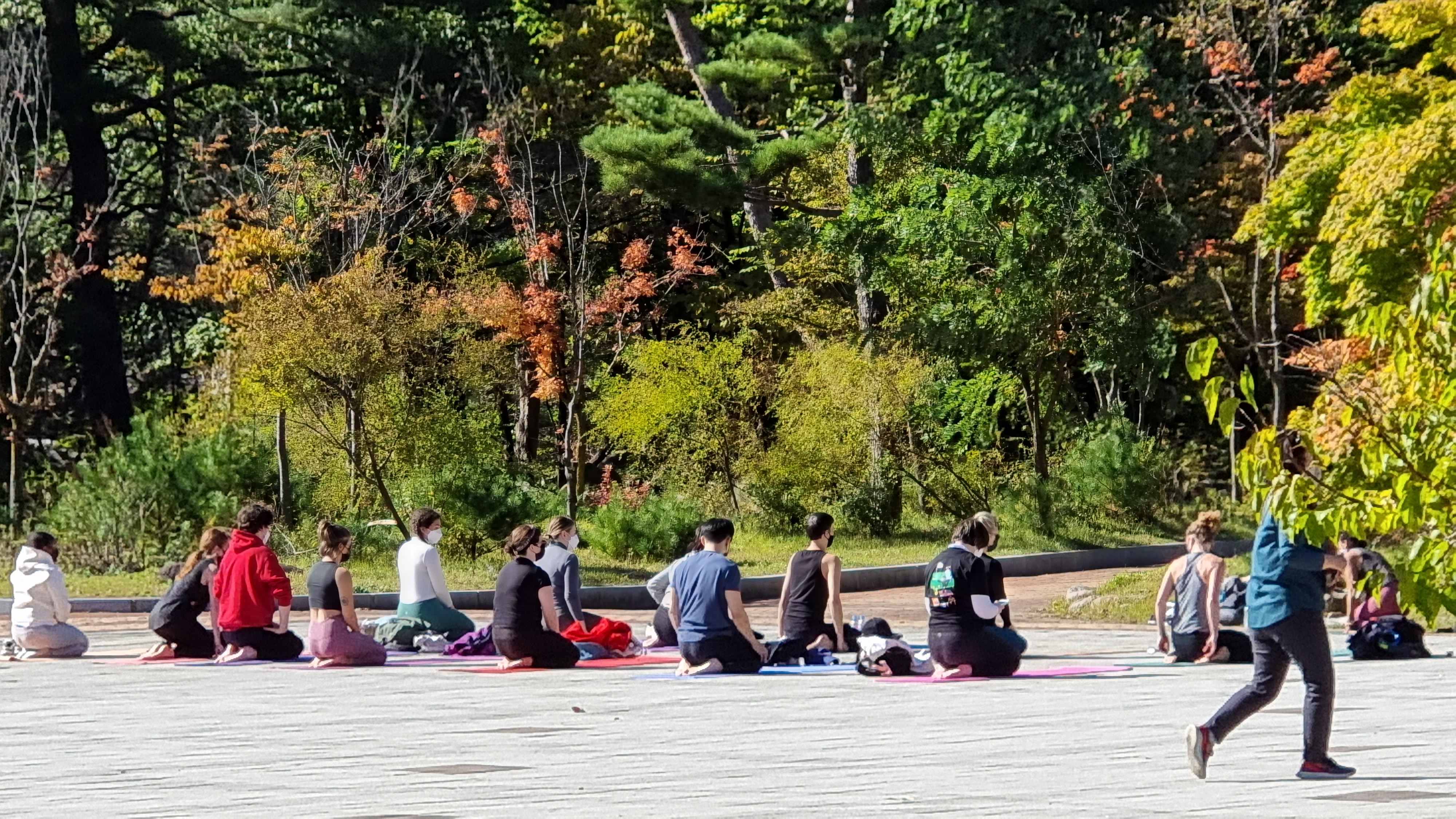 많은 사람들이 마스크를 쓰고 깊어가는 가을을 즐기고 있습니다.
