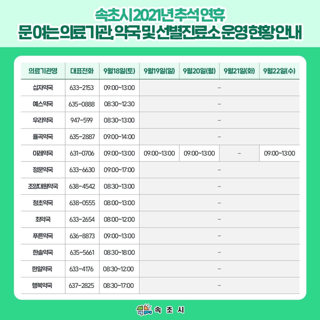 #속초 #속초시 #속초소식 #추석연휴 #추석명절기간 #연휴기간 #문여는의료기관 #문여는약국 #선별진료소 #운영현황 #운영일정