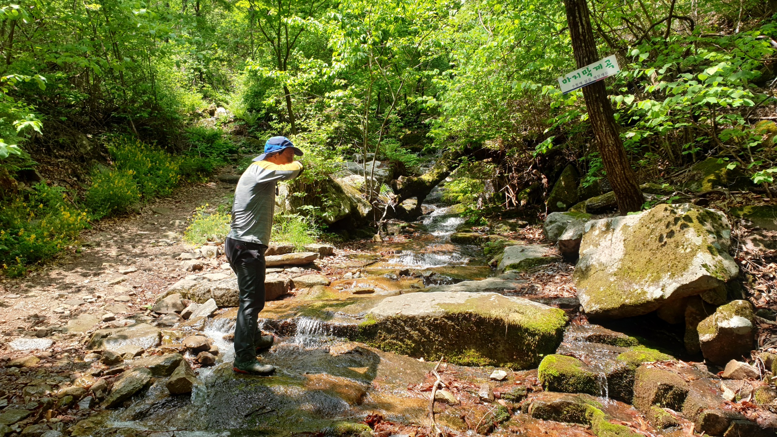 일행 중 한분이 컵으로 계곡물을 한컵 떠서 마시고 있네요.