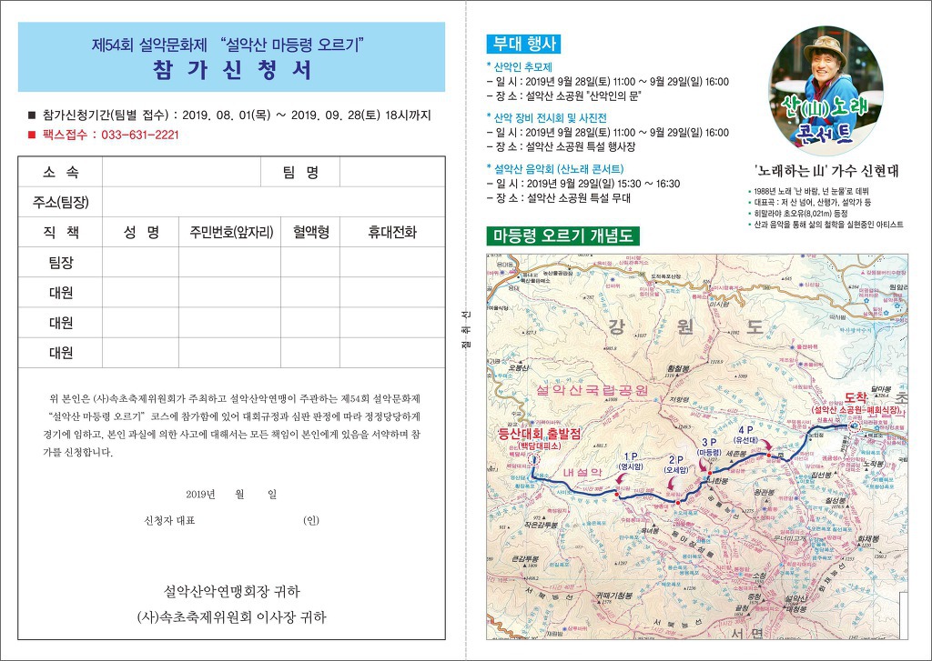 – 접수 : 인터넷 [설악산악연맹 까페 접수안내] 및 당일 현장 접수 가능[엑스포광장 상징탑]