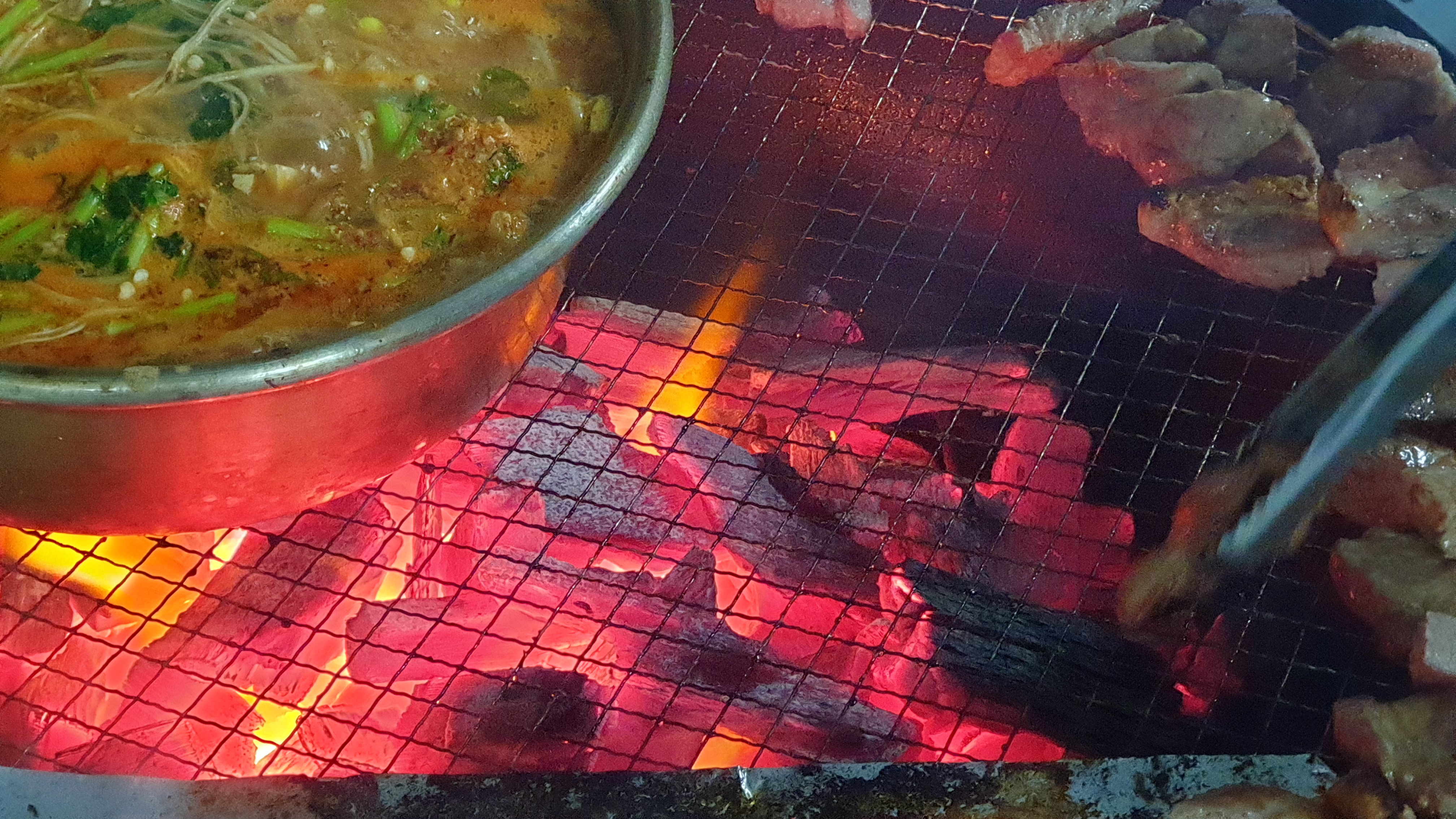 빨갛게 달아 오른 숯불에 돼지고기 올려놓고, 요리조리 굴려가며 구워 먹는 숯불구이 맛이야 두말하면 잔소리라 더 이상 말이 필요없지요.