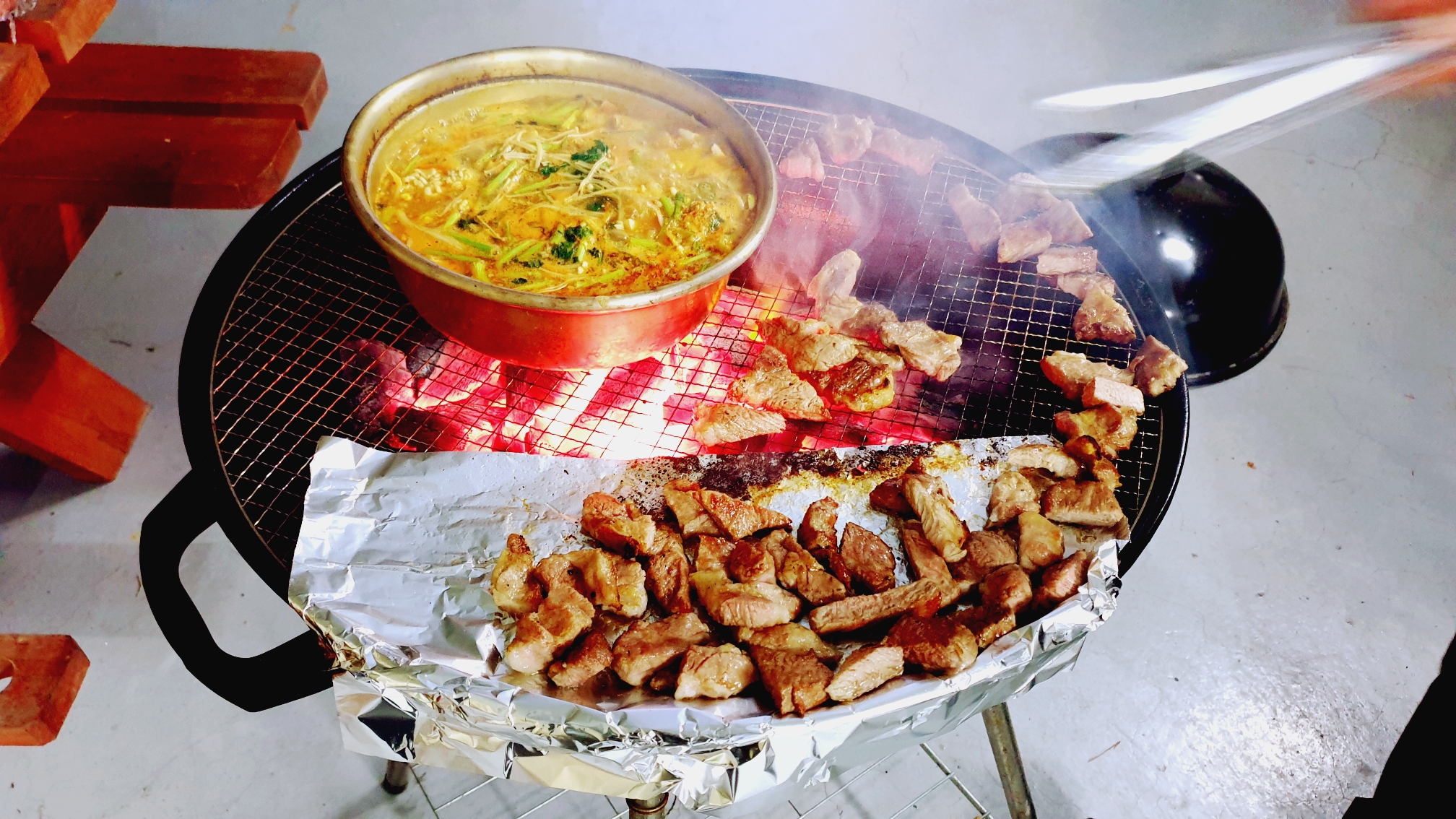 고성 쭌카라반에서 회의 마치고 먹는 숯불구이.