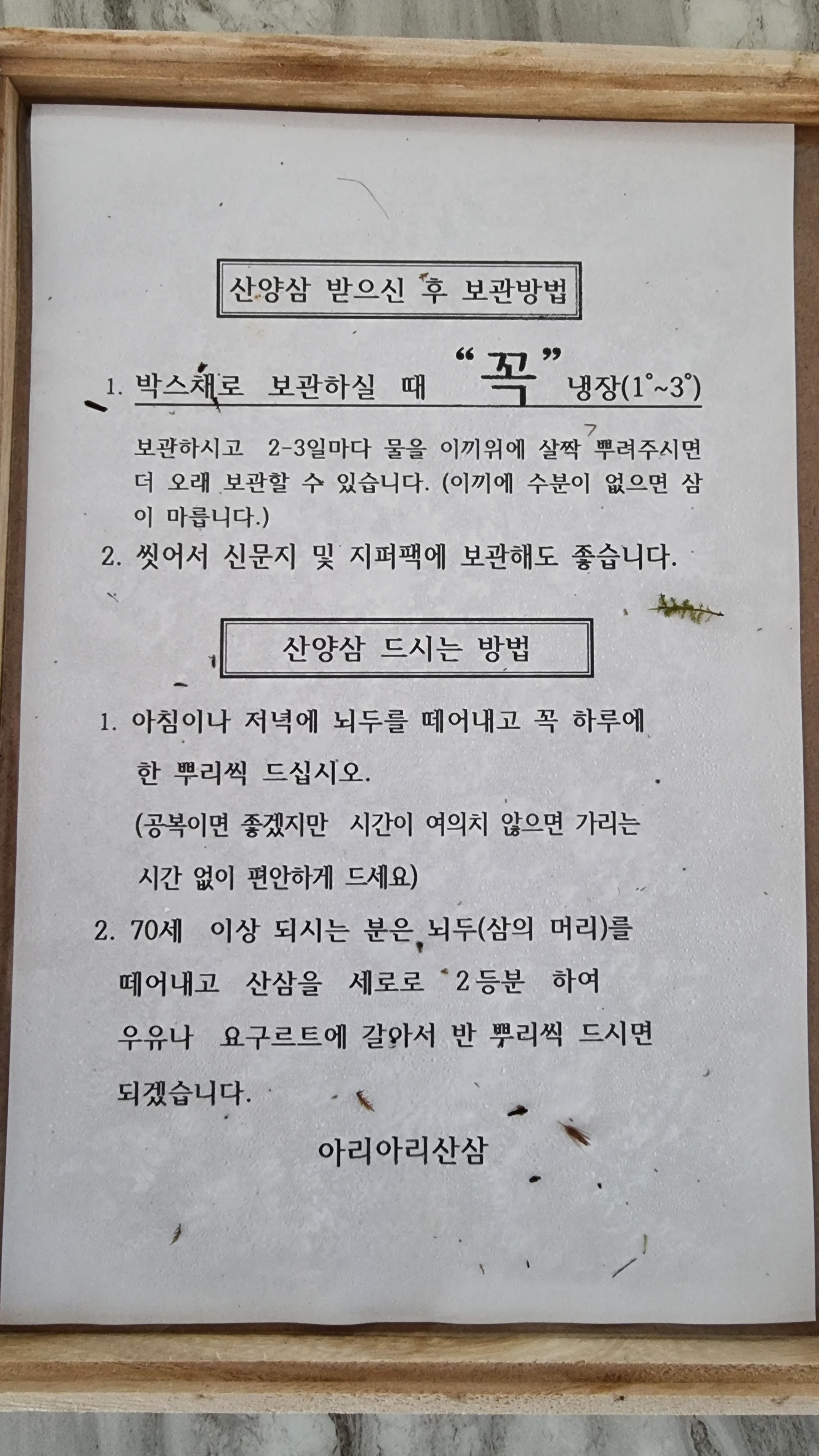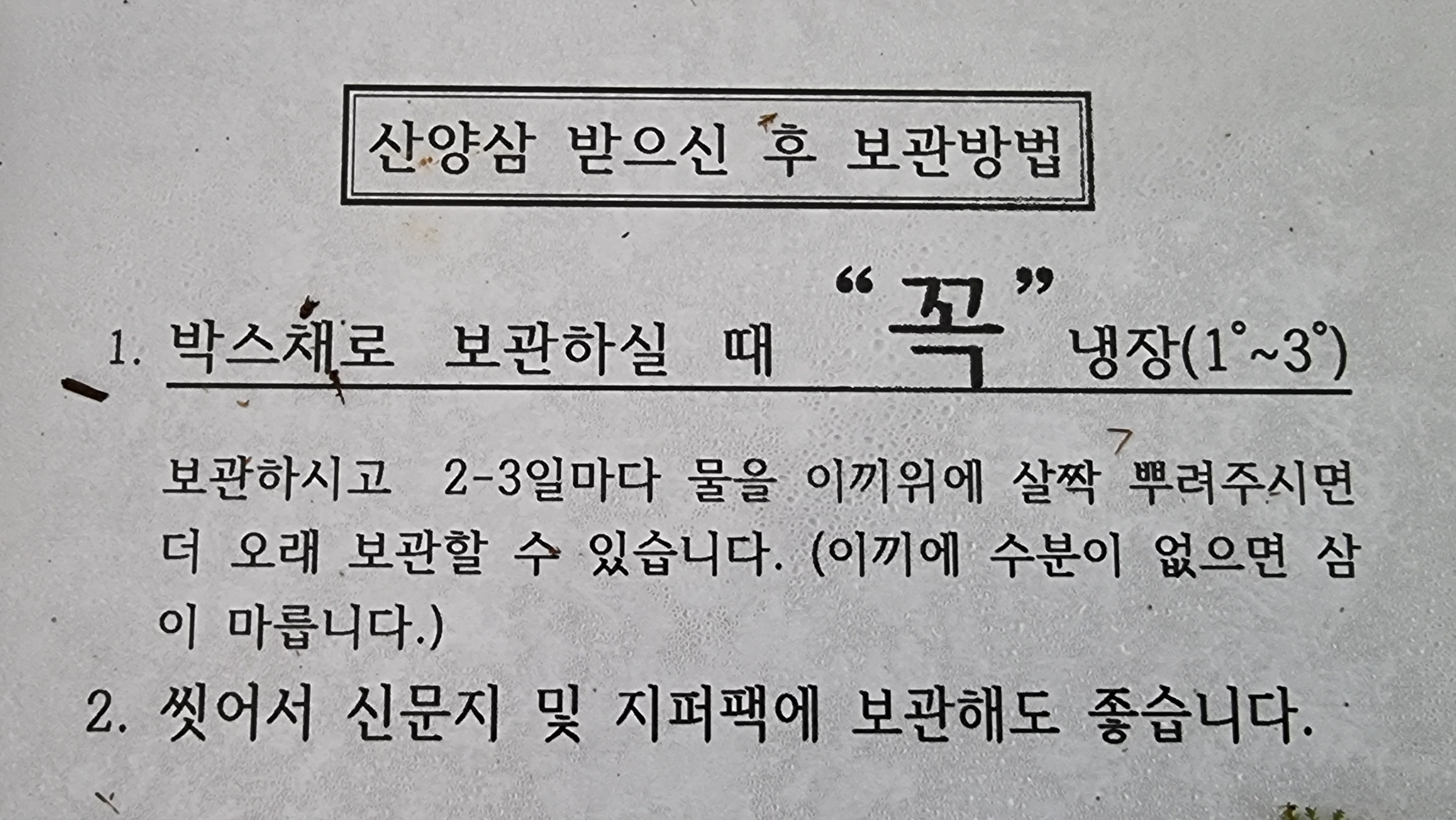 산양삼 보관은 냉장보관하고 2~3일마다 물을 이끼위에 살짝 뿌려주면 오래보관 할 수 있고, 씻어서 신문지나 지퍼팩에 보관해도 좋다고 합니다.