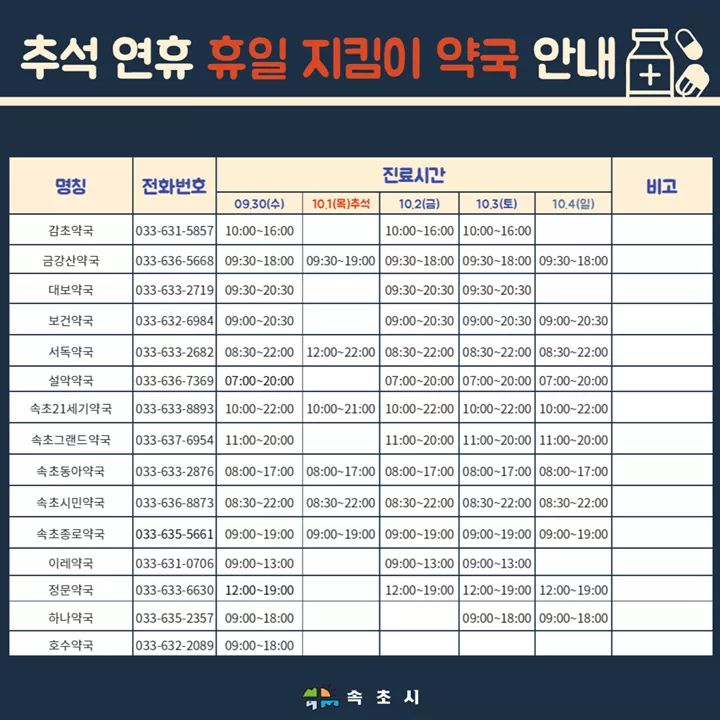 #강원도 #속초시 #속초 #추석 #연휴 #응급진료기관 #휴일지킴이 #약국 #안내 #확인부탁드립니다 #아프지마요 #즐겁고 #평안한 #명절을 #기원합니다
